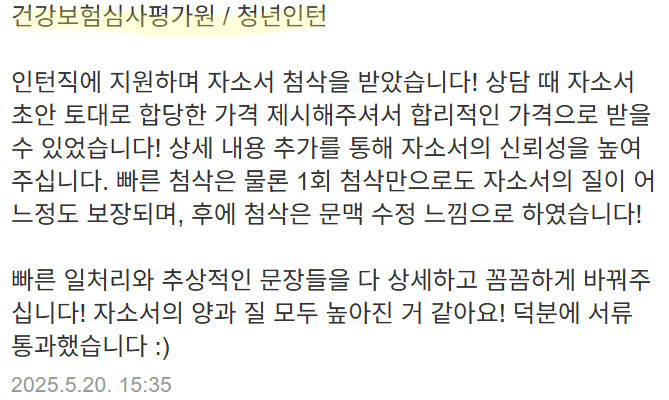 맞춤형 자기소개서 첨삭으로 서류 합격을 보장합니다. 만족도 5.0, 당일 완성 가능!