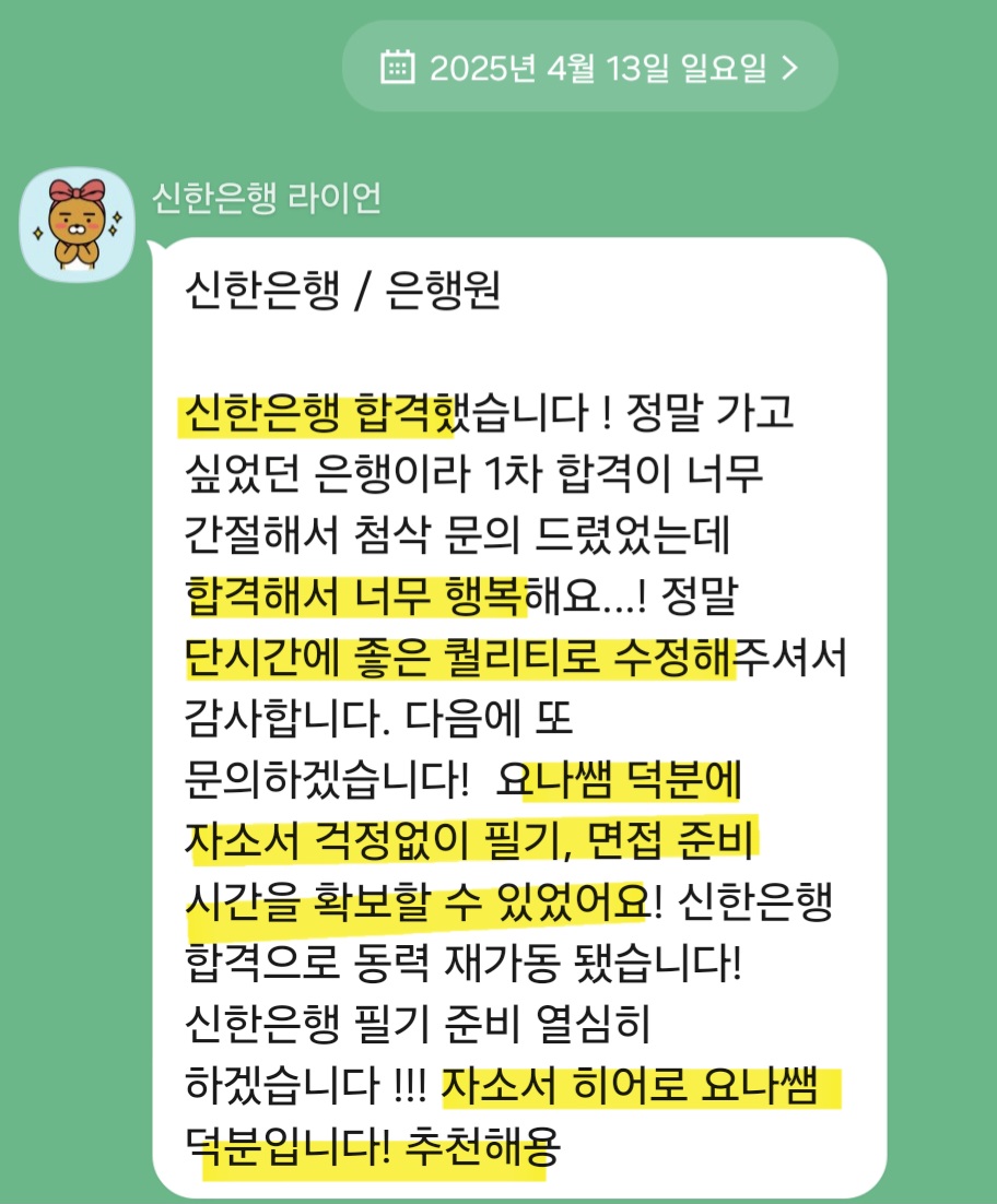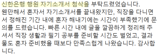 24시간 이내 신한은행 합격을 위한 맞춤 자기소개서 첨삭 서비스를 제공해드립니다.