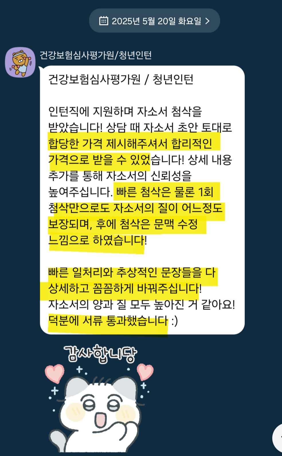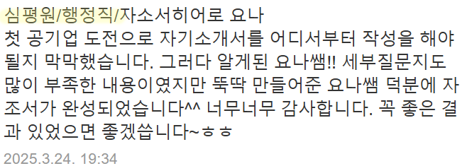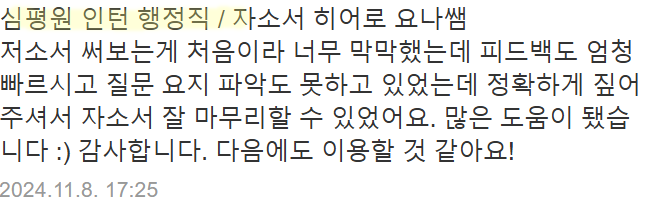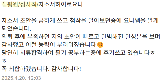 제가 진행한 첨삭 후기와 성과는 다음과 같습니다.