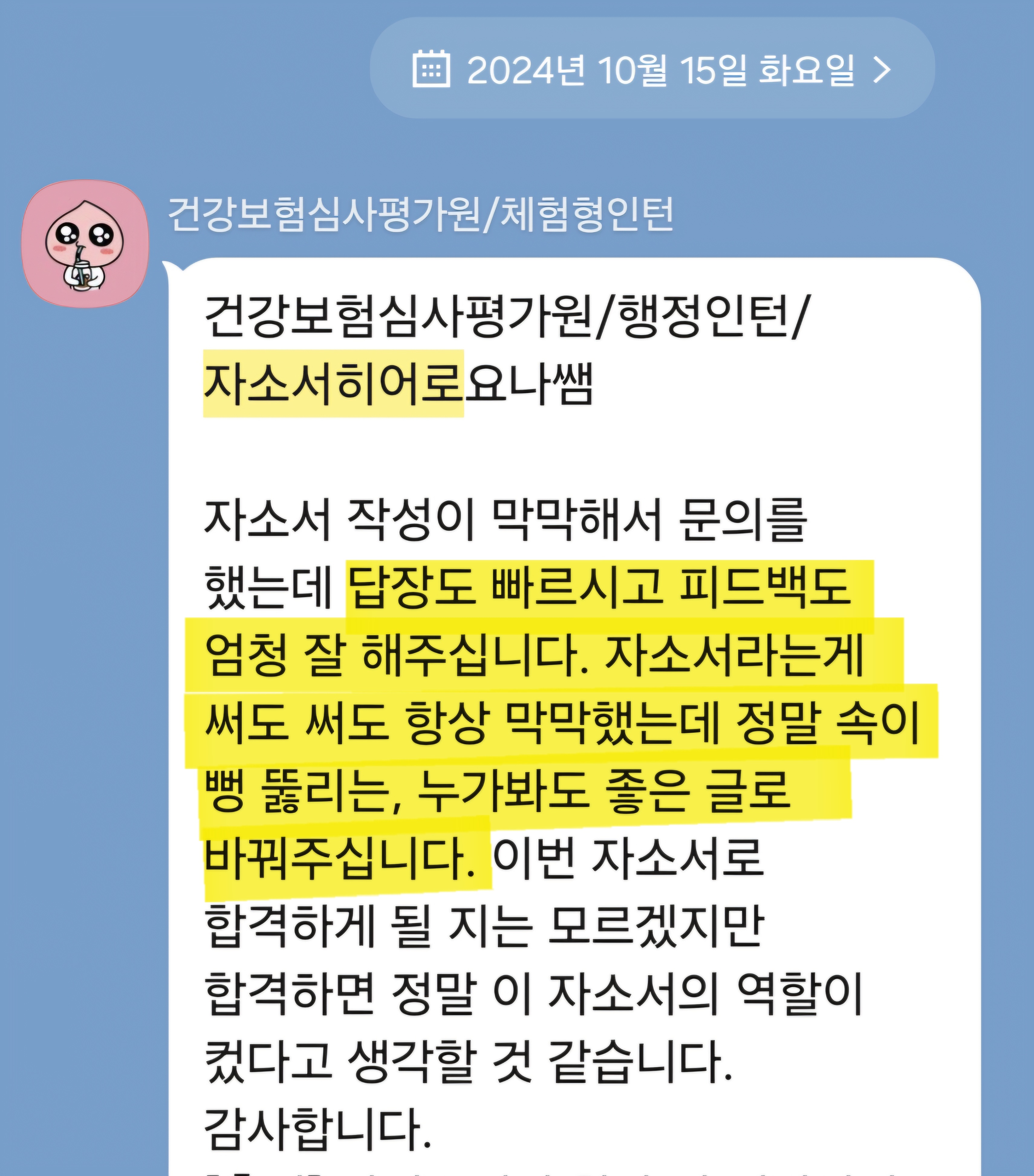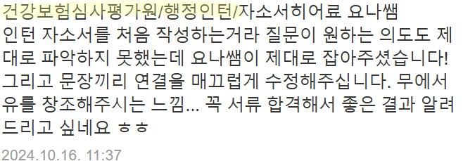 맞춤형 자기소개서 첨삭으로 서류 합격을 보장합니다. 만족도 5.0, 당일 완성 가능!
