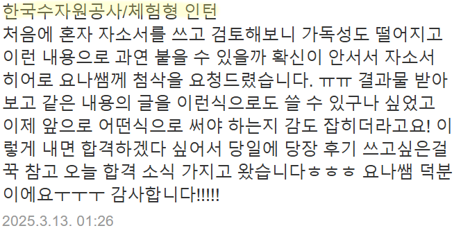 자소서히어로는 한국수자원공사 채용을 포함하여 수많은 공공기관 첨삭·대필 경험을 보유하고 있습니다.