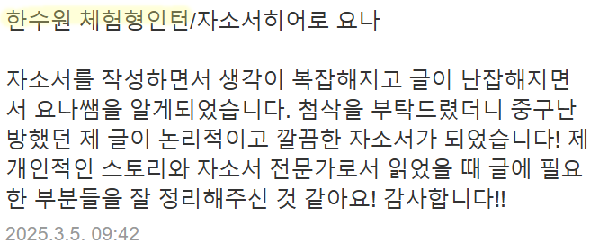 10년간 대학 취업센터에서 활동하며 3만 건 이상의 서류·면접 컨설팅을 진행해 왔고, 오랜 기간 95% 이상의 서류 합격률을 유지하며 수많은 합격 사례를 만들어 왔습니다.