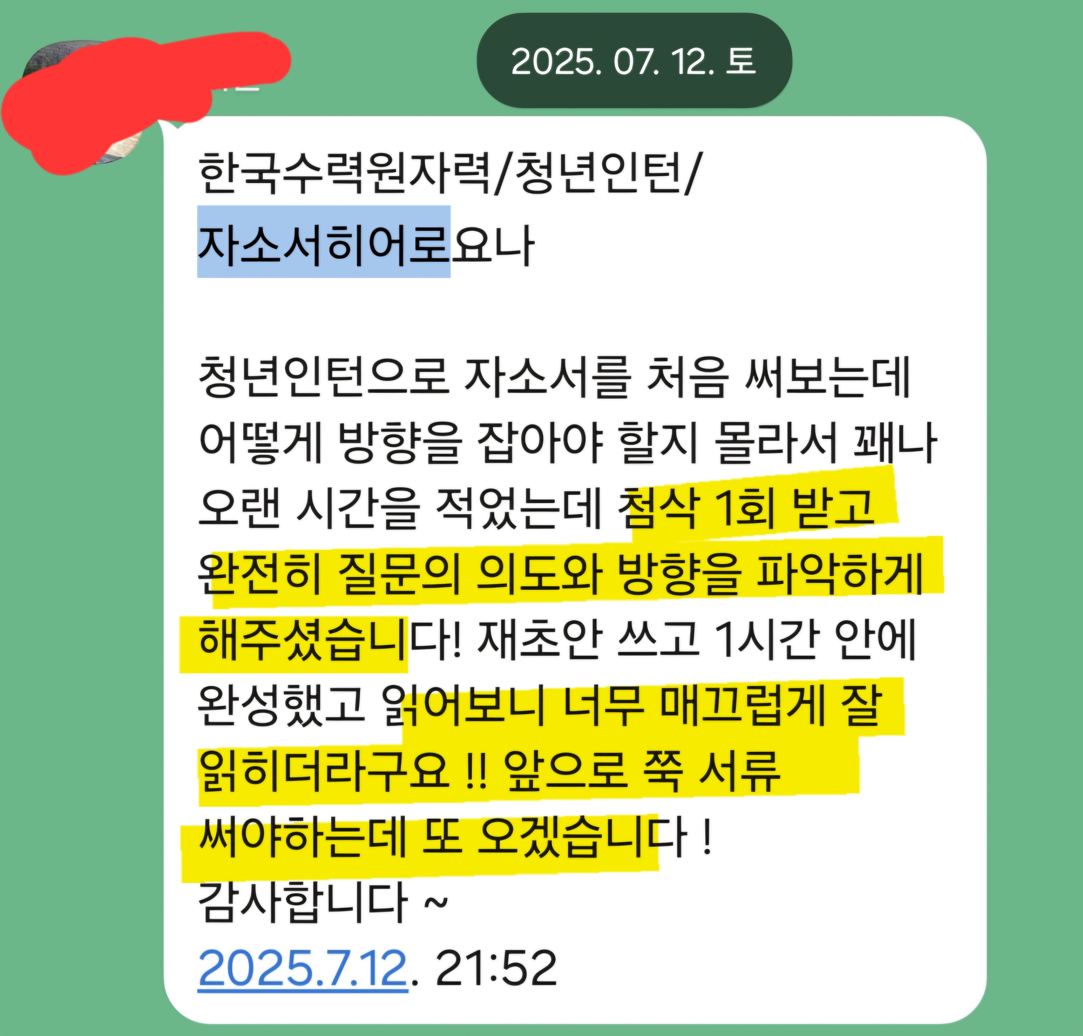 맞춤형 자기소개서 첨삭으로 서류 합격을 보장합니다. 만족도 5.0, 당일 완성 가능!