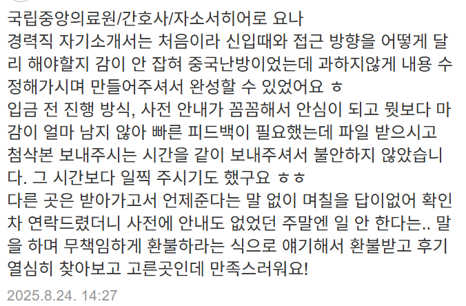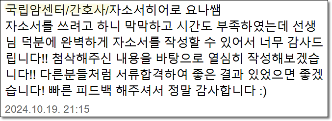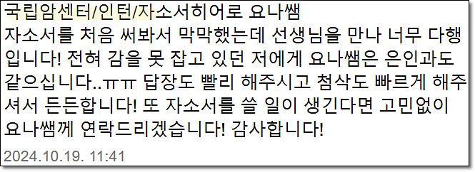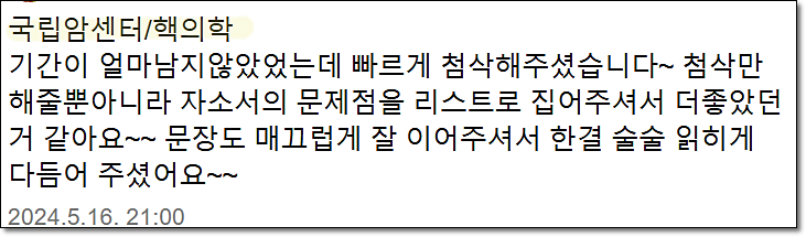 24시간 내 국립암센터 합격을 위한 맞춤 자기소개서 첨삭 대행을 제공합니다.