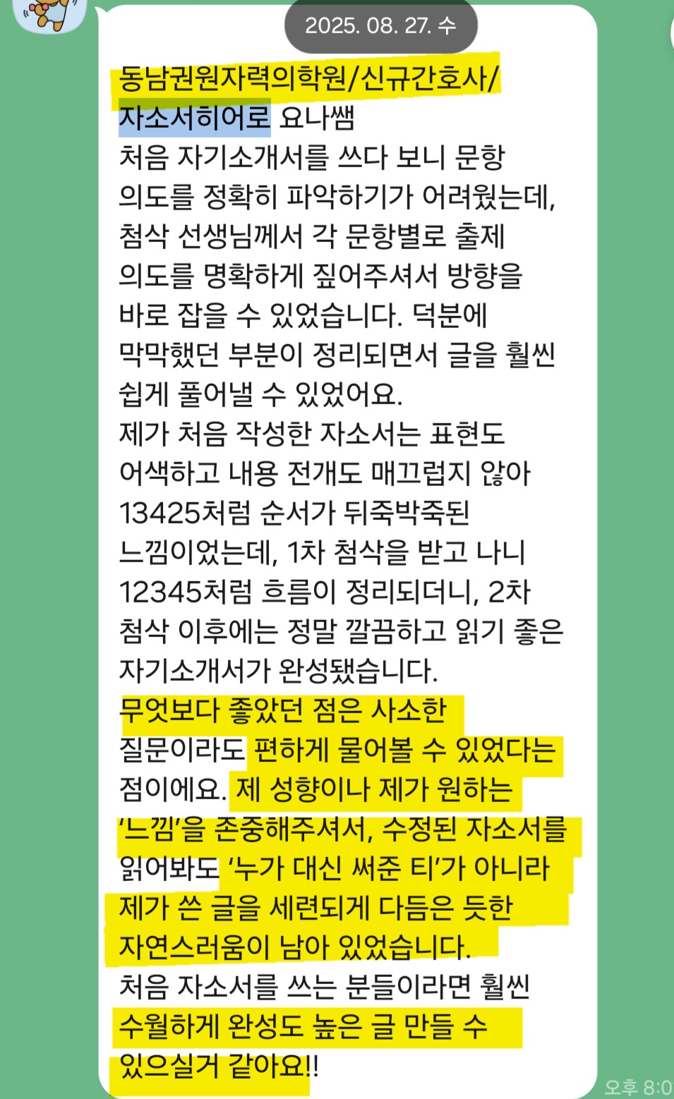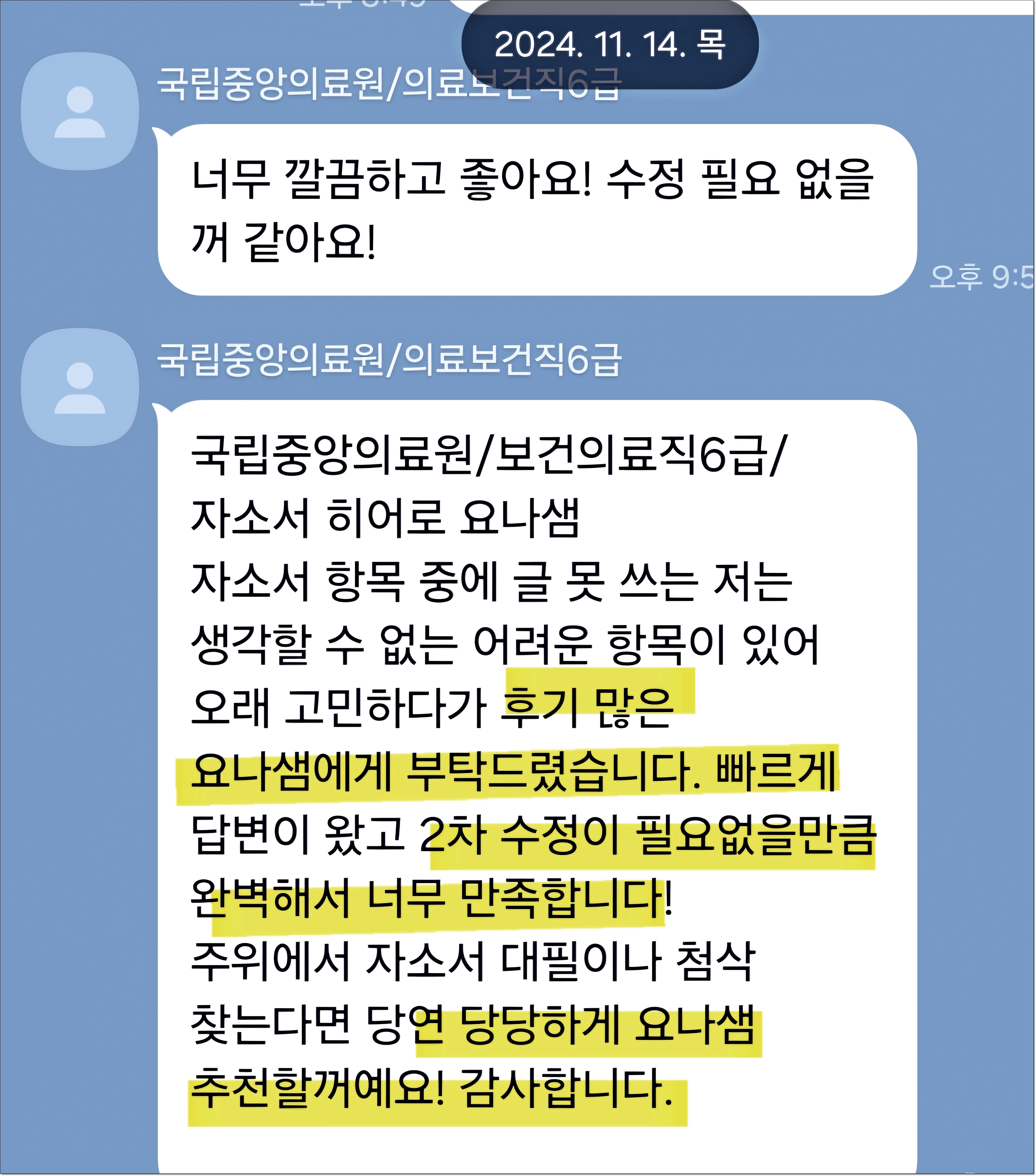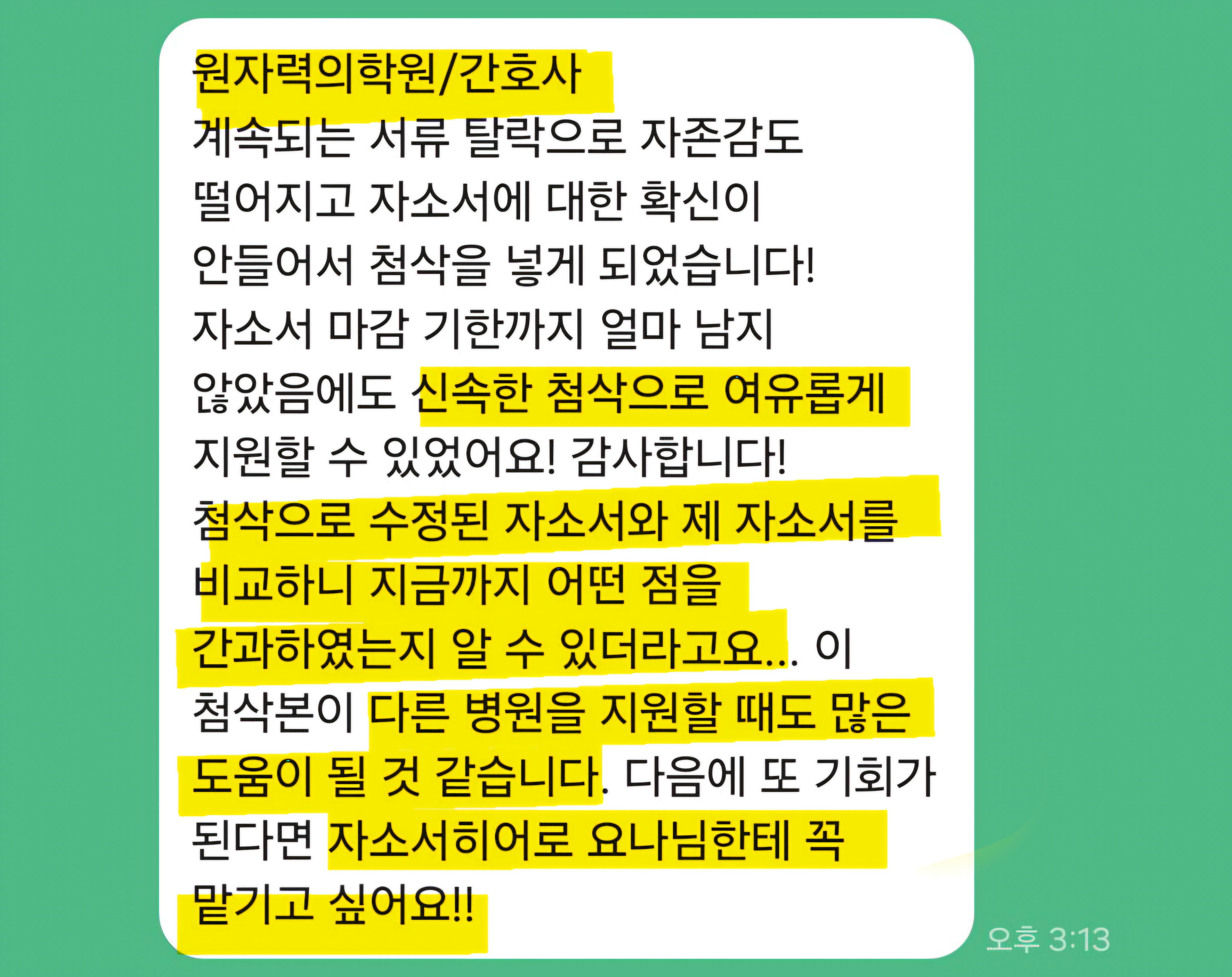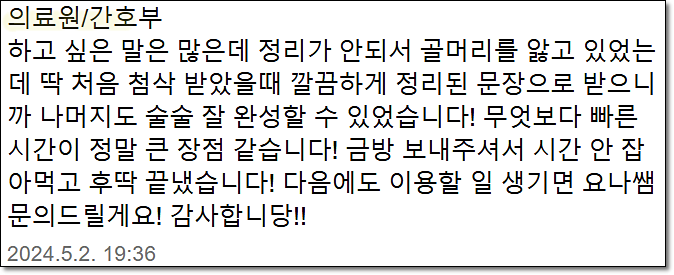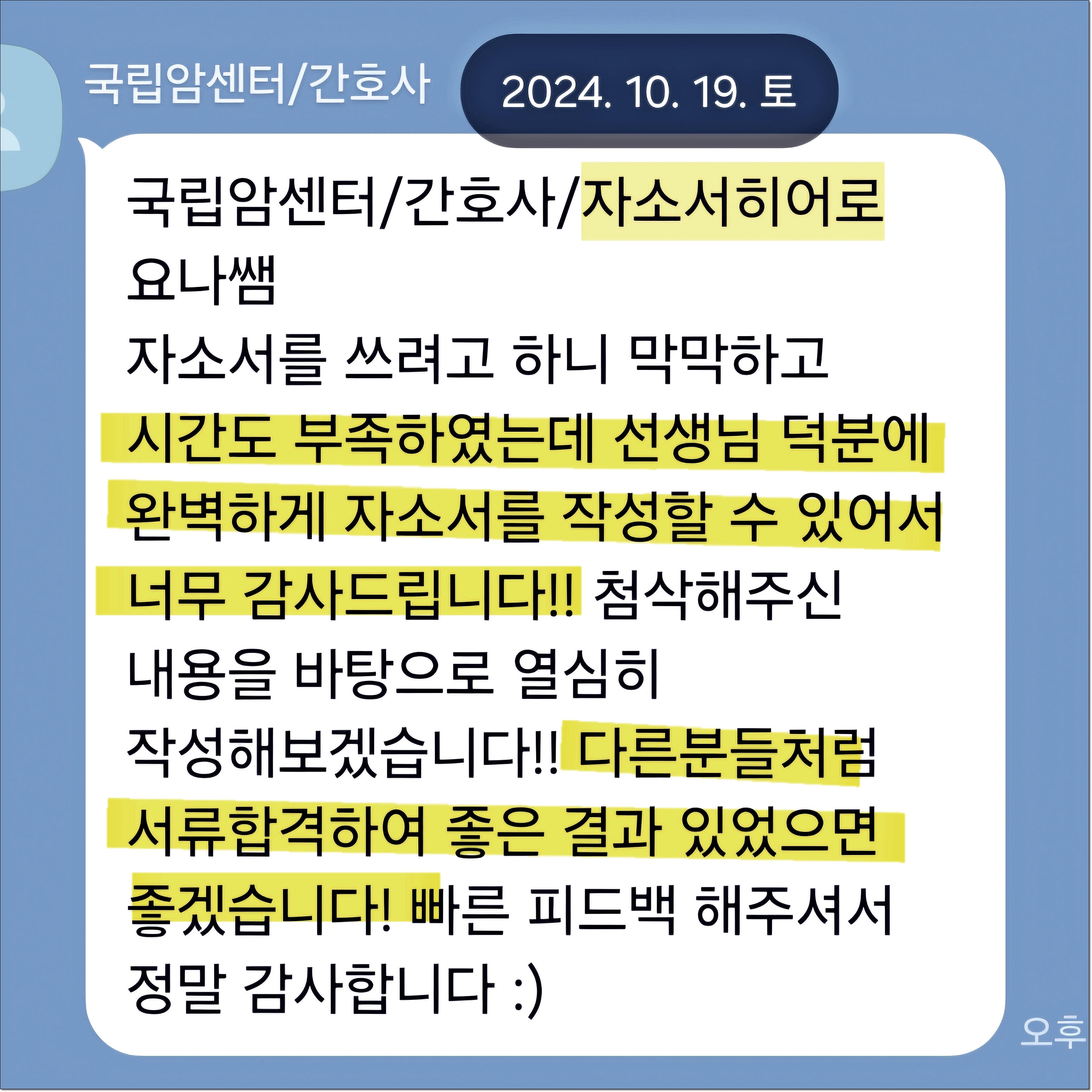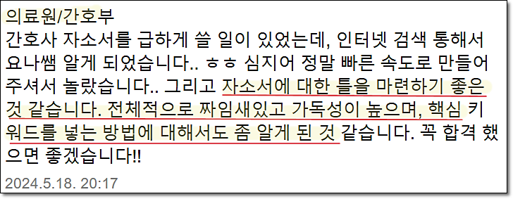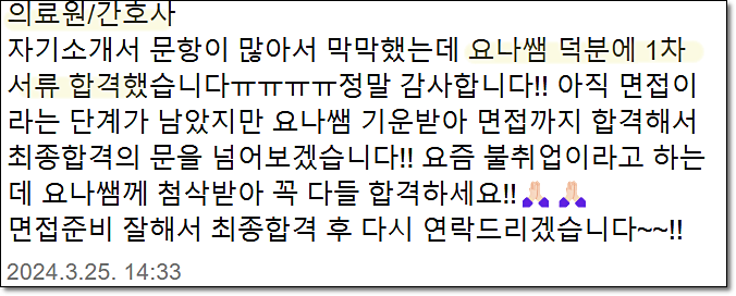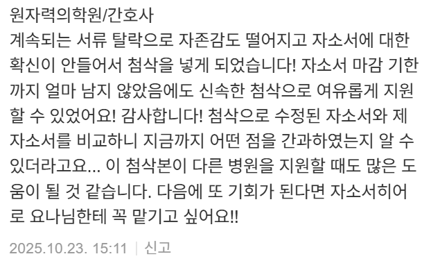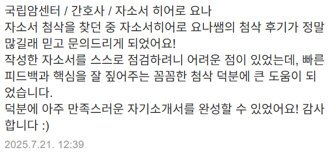 10년 이상의 경력과 95% 이상의 합격률을 유지하고 있으며, 병원·공공기관·의료직 자기소개서에 특화되어 있습니다.