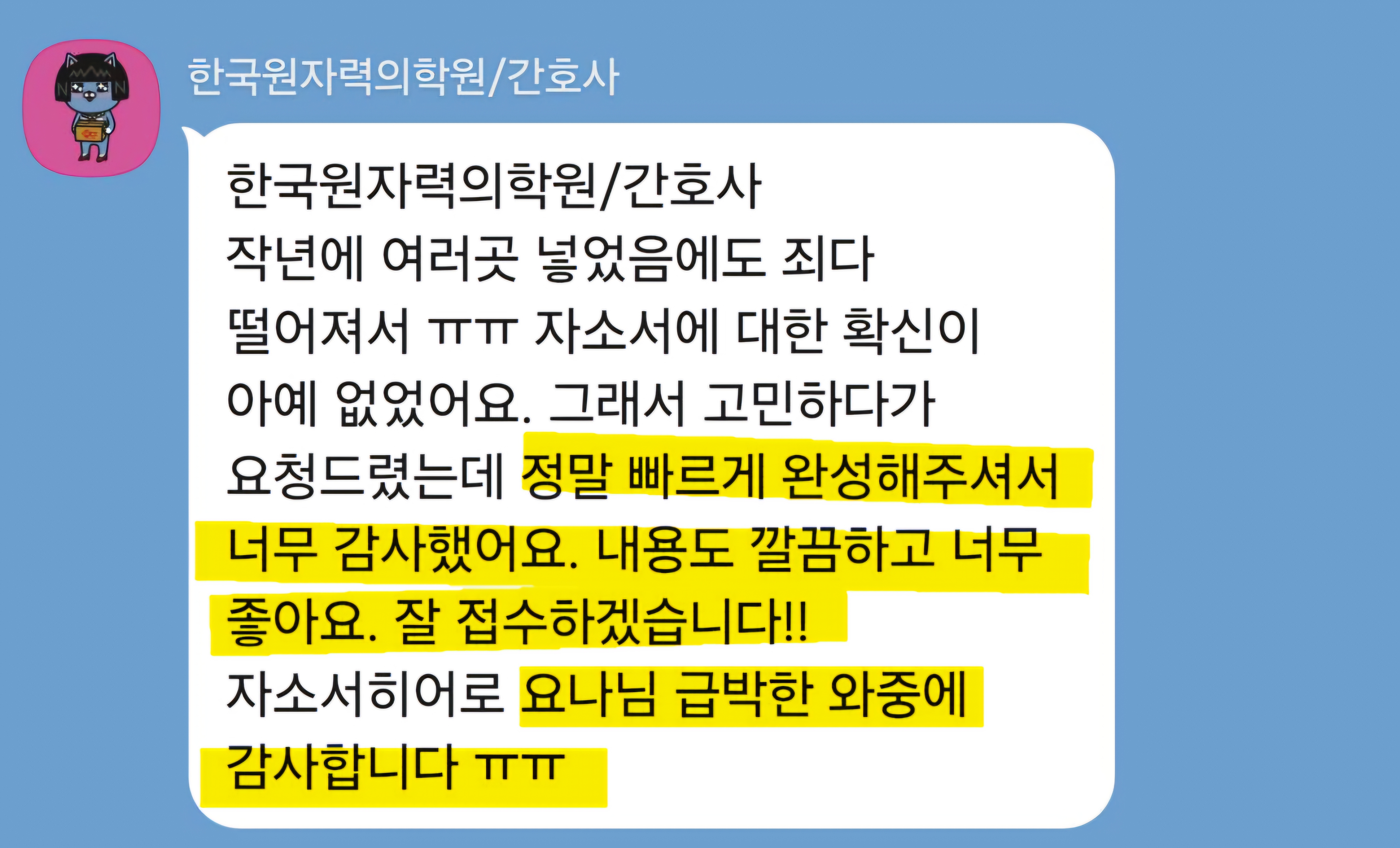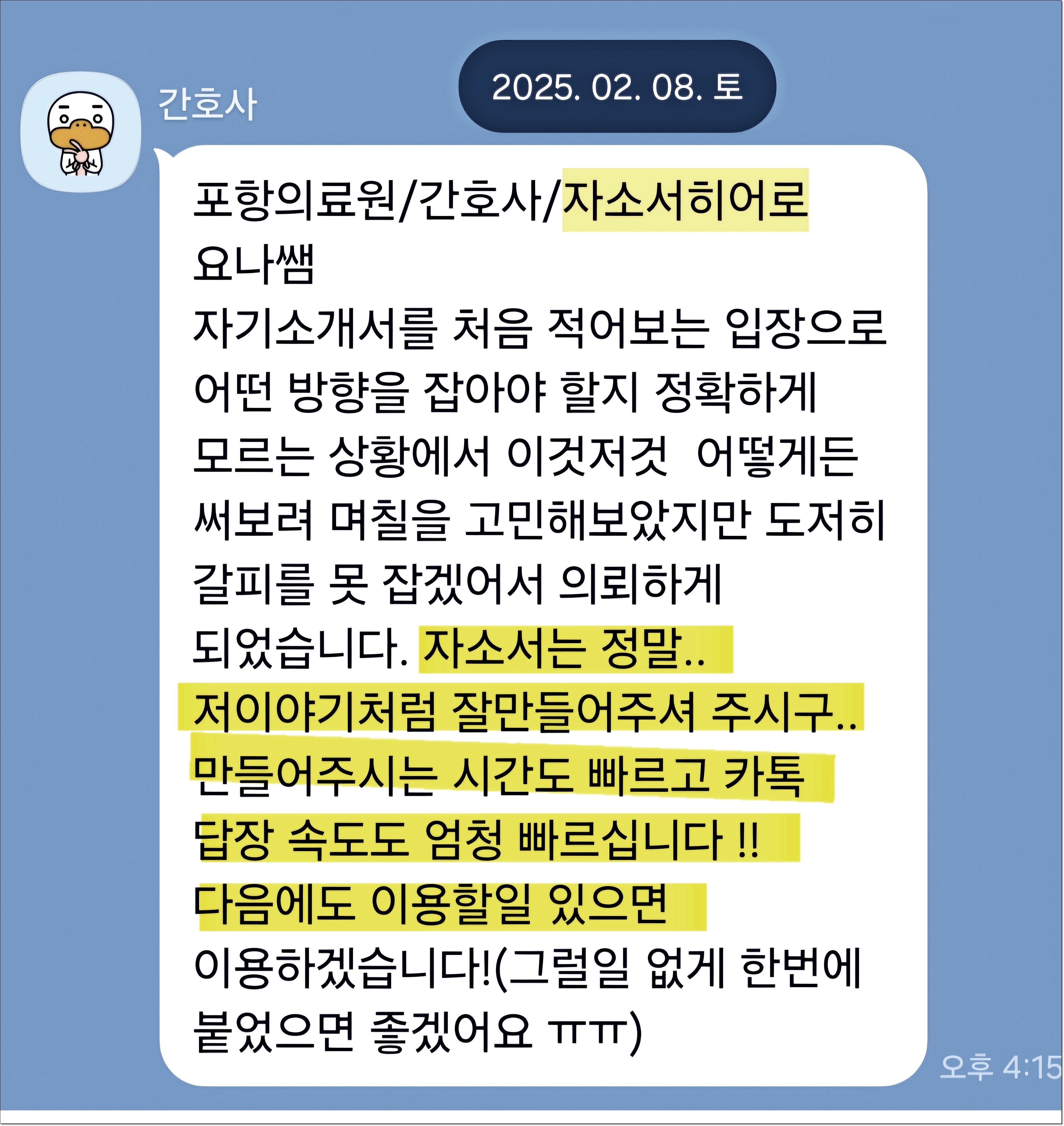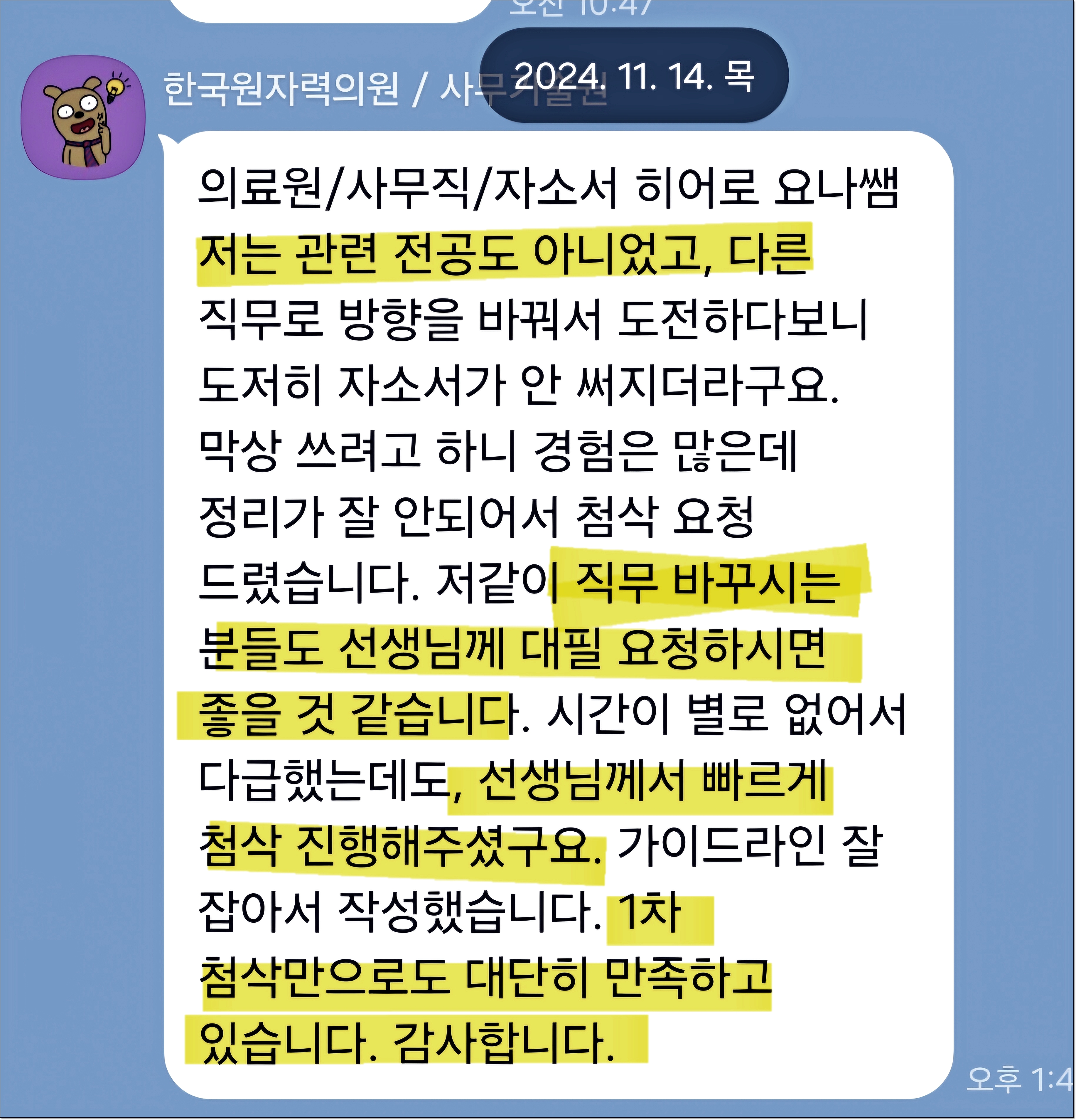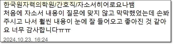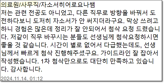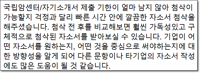 맞춤형 자기소개서 첨삭으로 서류 합격을 보장합니다. 만족도 5.0, 당일 완성 가능!