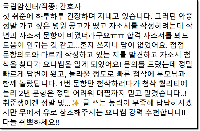 오늘은 국립암센터 간호사 채용 자기소개서 작성 방법에 대해 안내드리겠습니다.