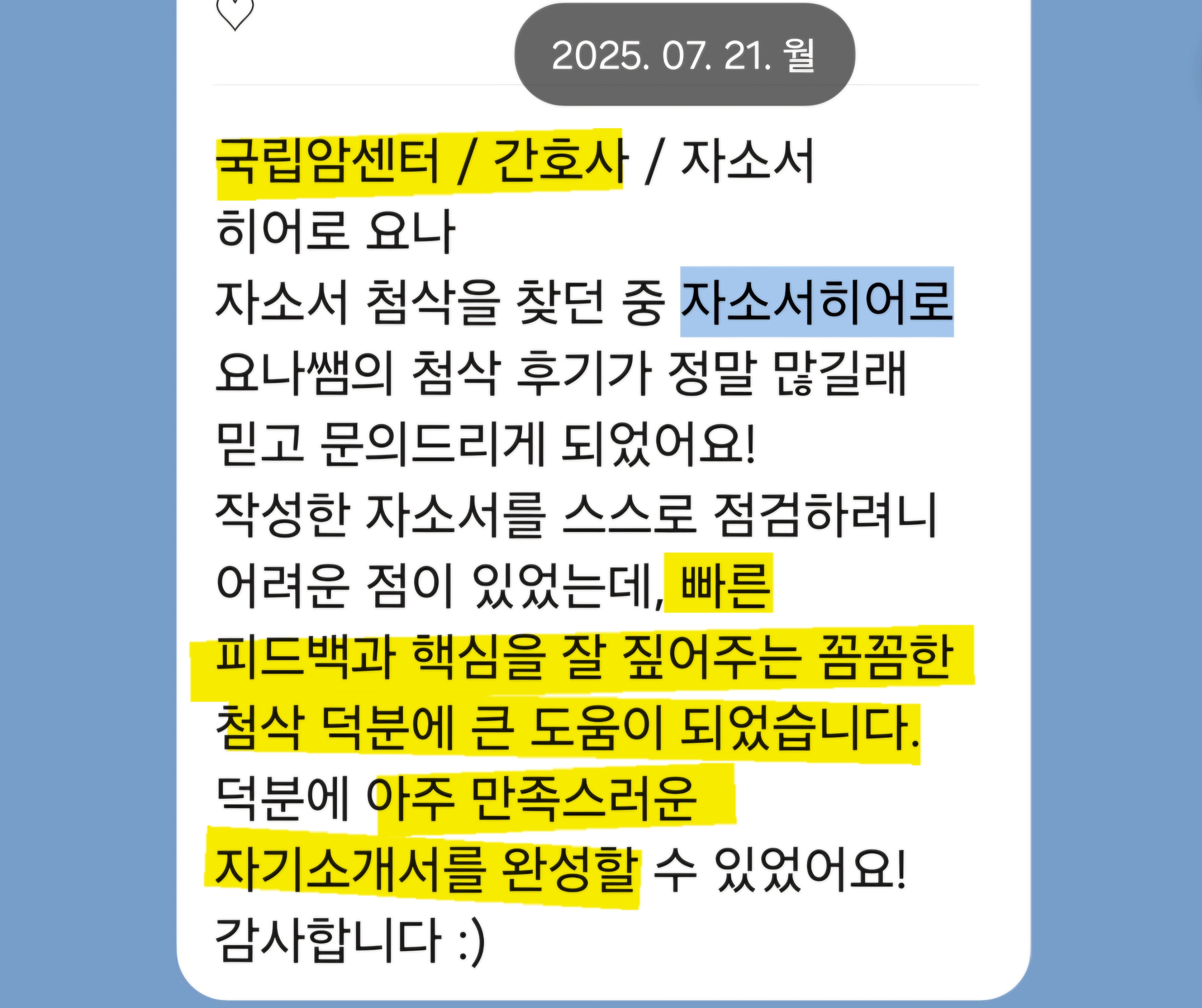 10년 이상의 경력과 95% 이상의 합격률을 유지하고 있으며, 병원·공공기관·의료직 자기소개서에 특화되어 있습니다.