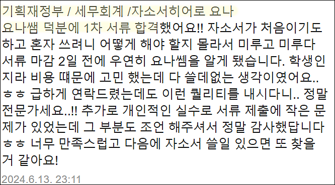지난 10년간 95% 이상의 서류 합격률을 기록하며, 지난해 3,000명, 매달 30명 이상의 취업 준비생들을 합격으로 이끌어드리고 있는 취업 컨설턴트 자소서히어로 요나입니다.