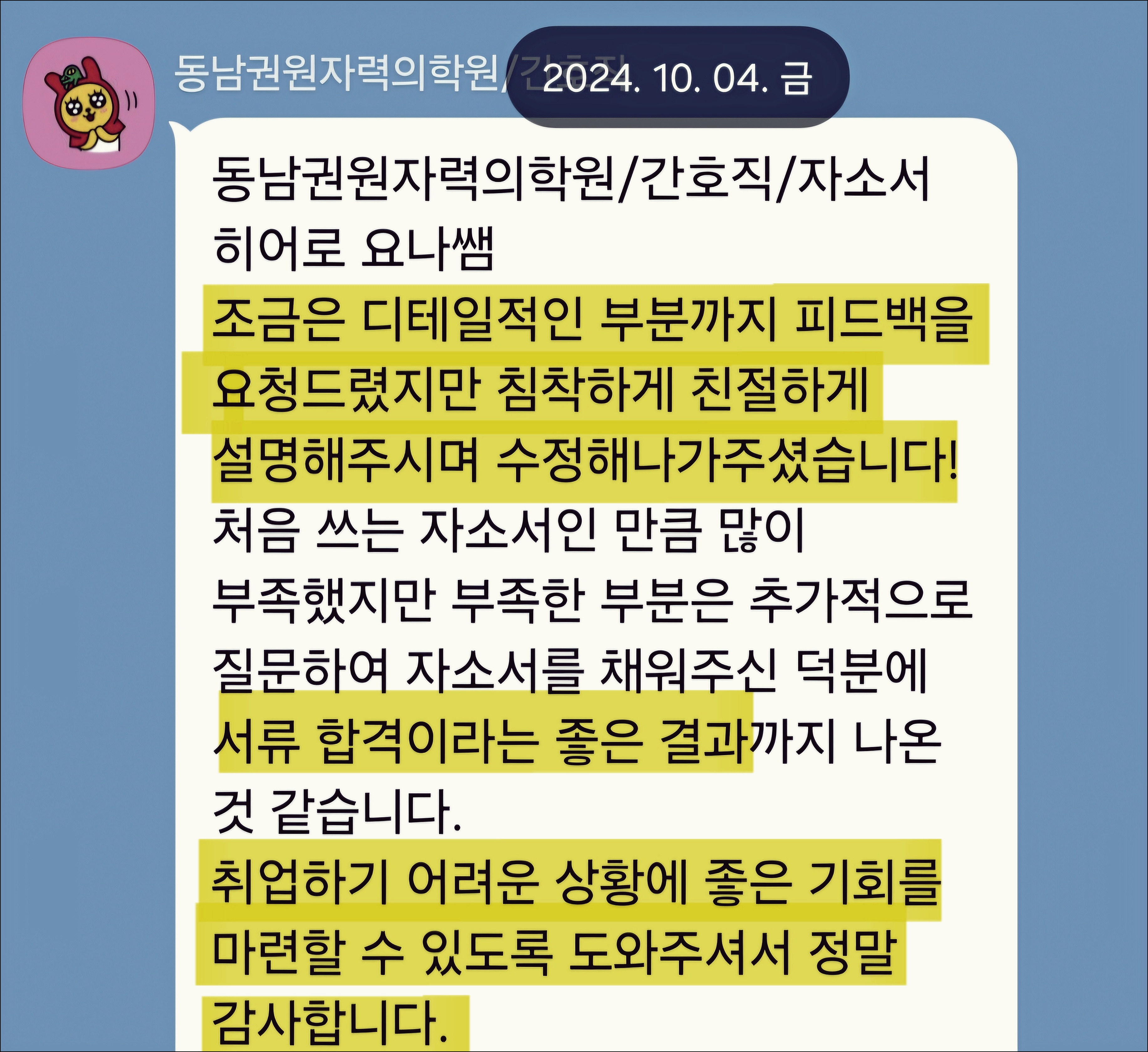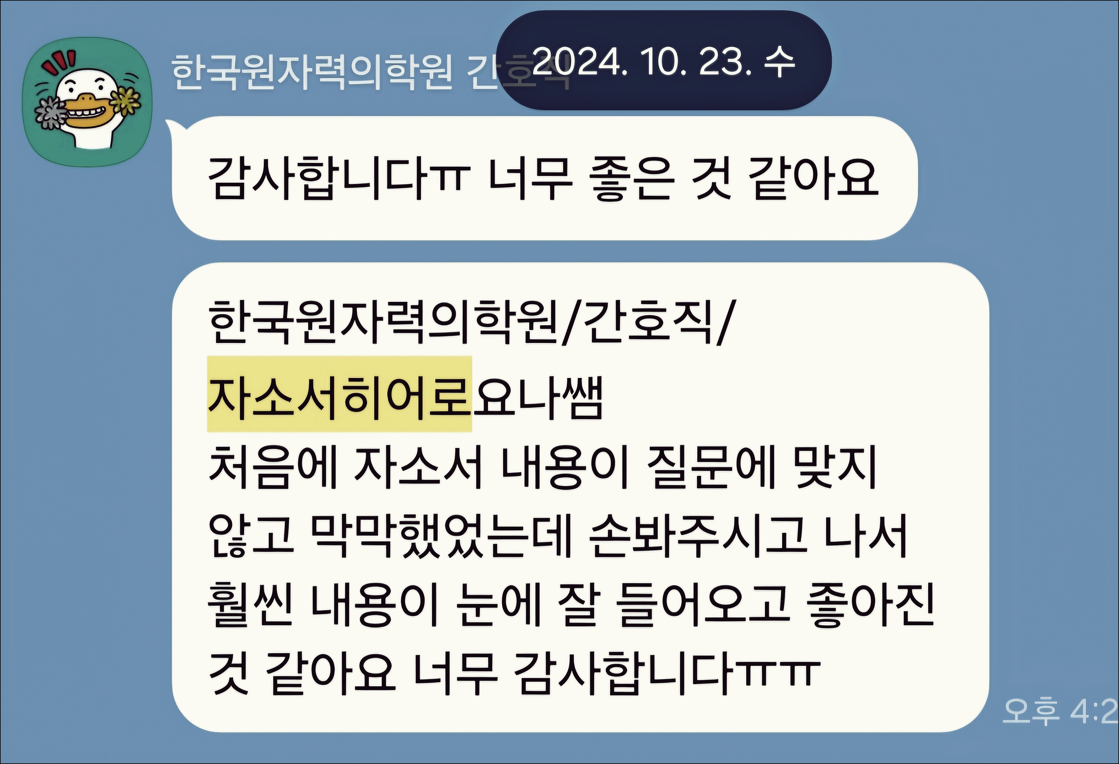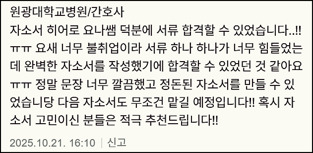 자소서히어로 요나는 10년간 대학 취업센터와 민간 의뢰를 통해 3만 건 이상의 서류·면접 컨설팅을 진행해 왔습니다. 특히 근로복지공단 간호사 분야에서 다수의 합격 사례를 보유하고 있으며, 기관의 핵심 가치를 반영한 맞춤형 자기소개서를 제공합니다.