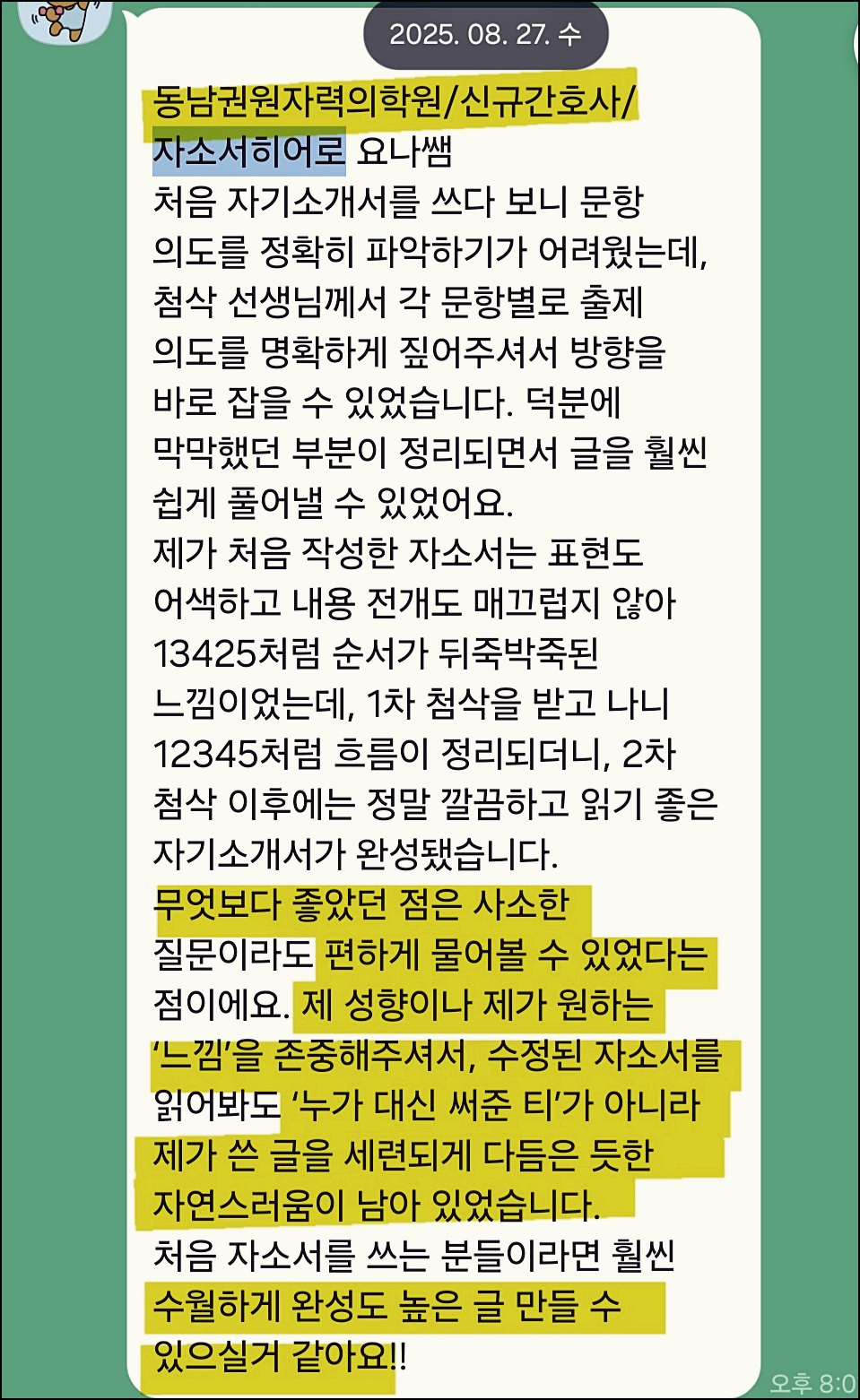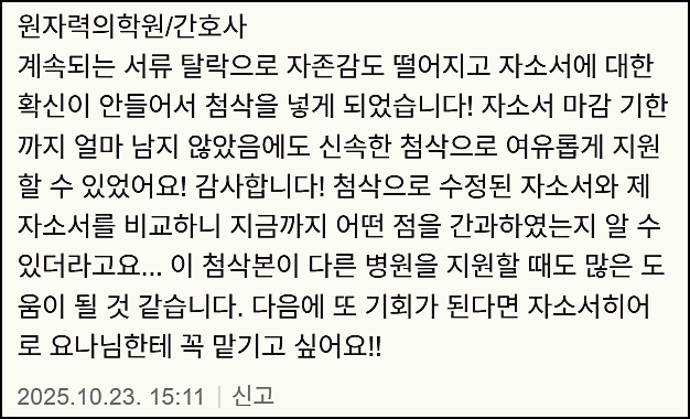 맞춤형 자기소개서 첨삭으로 서류 합격을 보장합니다. 만족도 5.0, 당일 완성 가능!