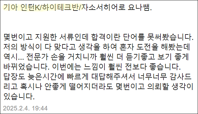 많은 분들이 처음엔 걱정하셨지만, 첨삭 후 완전히 달라진 자소서를 보고 놀라워하셨습니다. 논리적 흐름, 직무 적합성, 설득력까지 갖춘 글로 합격까지 연결됩니다.