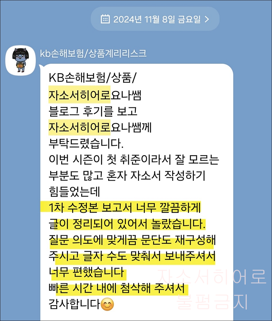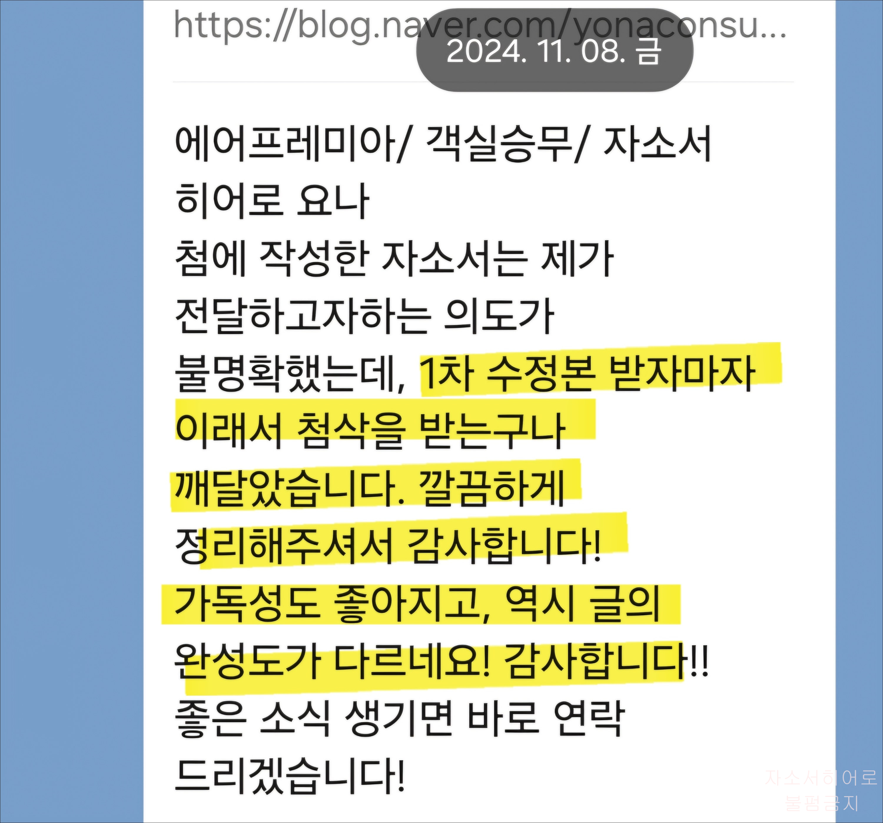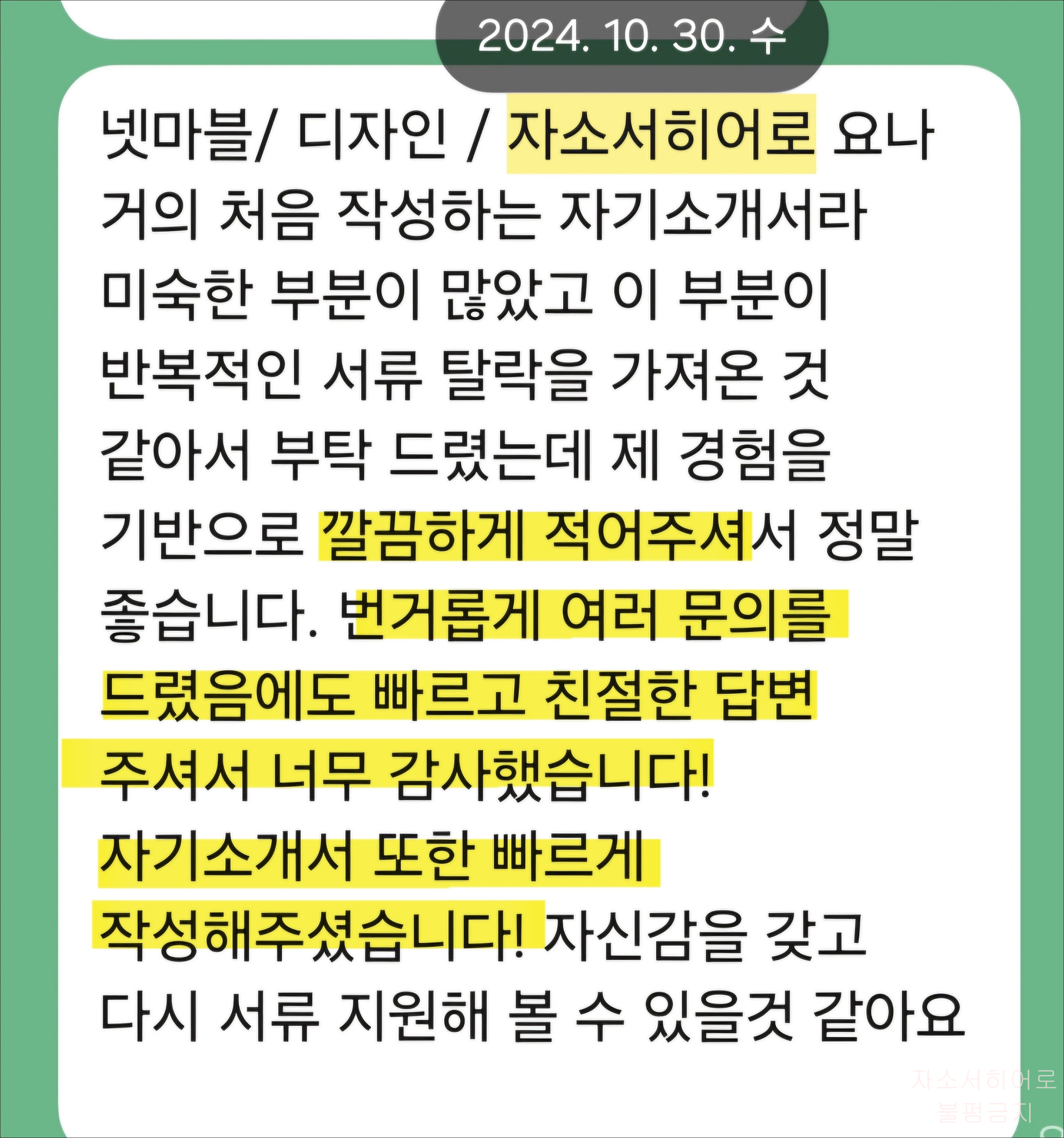 안녕하세요. 대기업, 공기업, 은행, 항공사, 병원 등 다양한 분야의 직무를 준비하고 계신 의뢰인분들께 맞춤 자기소개서 첨삭 대행 서비스를 제공하는 자소서히어로 요나입니다.
