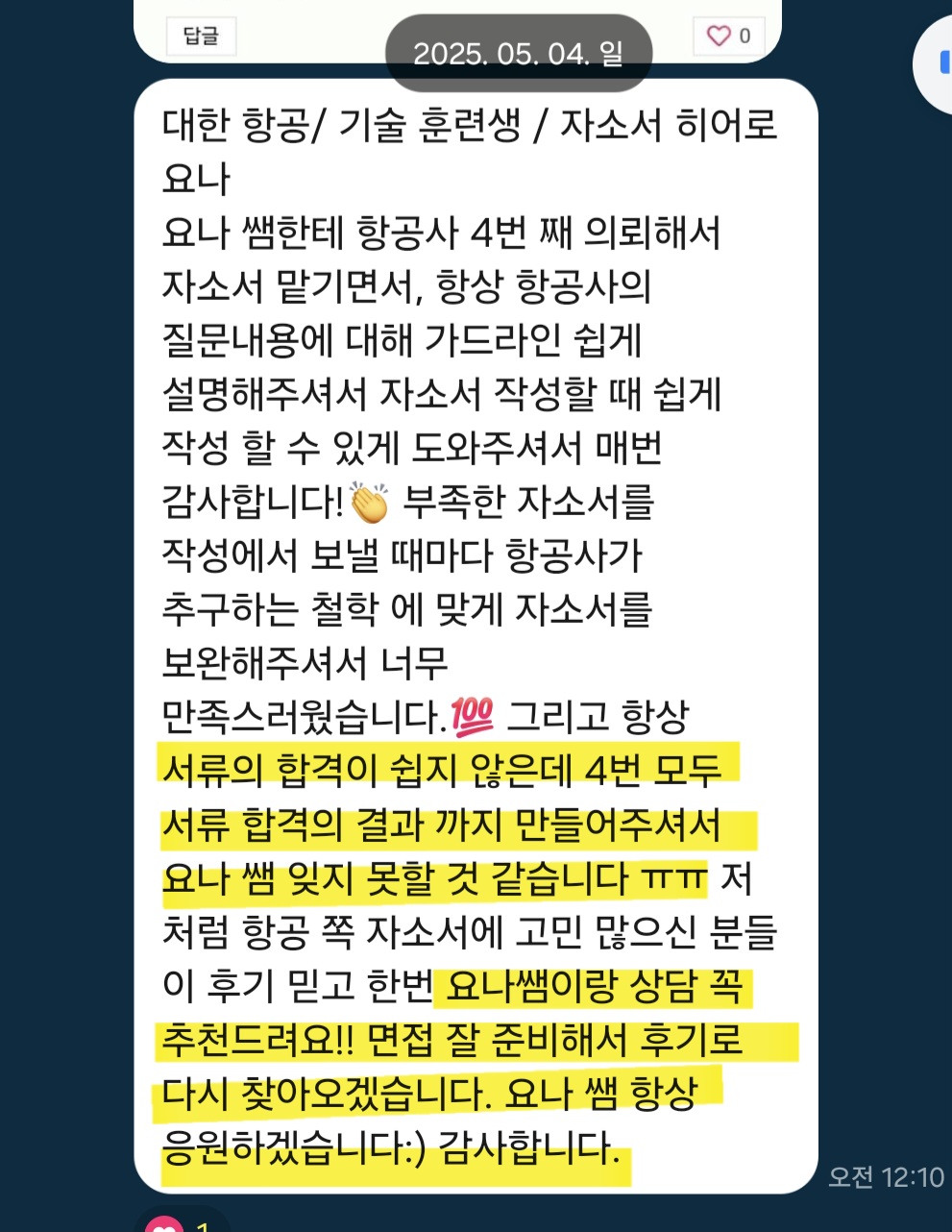 자소서히어로는 수많은 항공사 자기소개서를 첨삭 및 대필한 이력을 보유하고 있으며, 실제 합격률 95% 이상을 기록하고 있습니다.