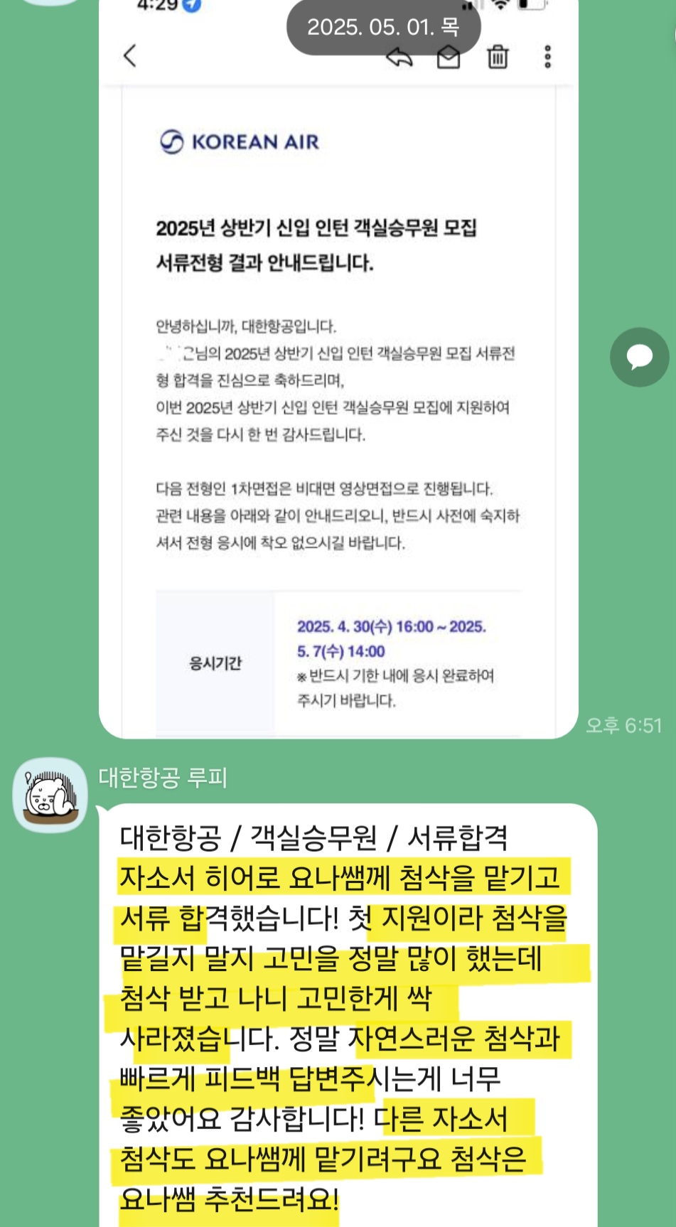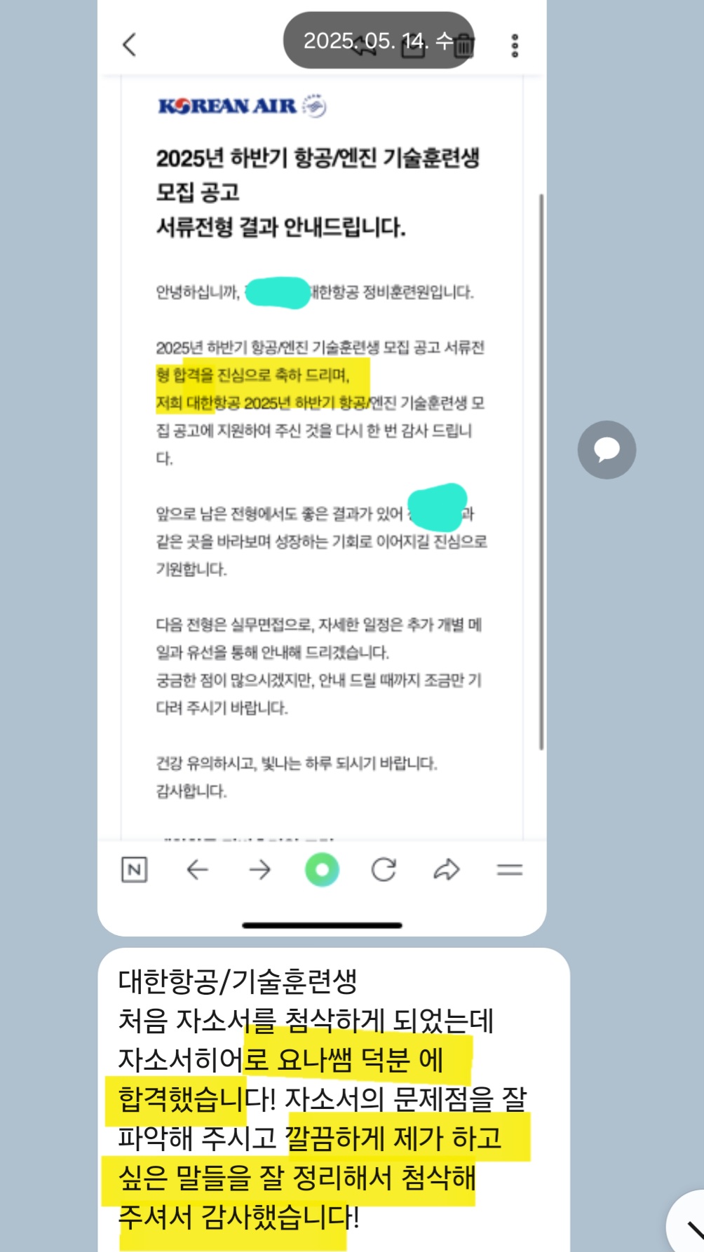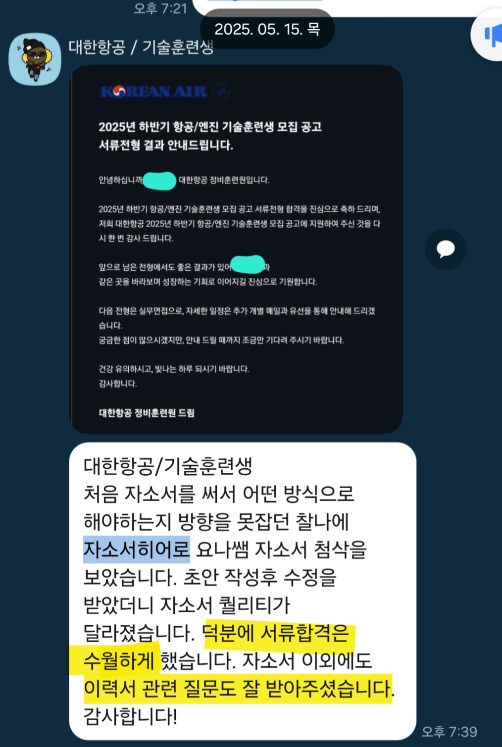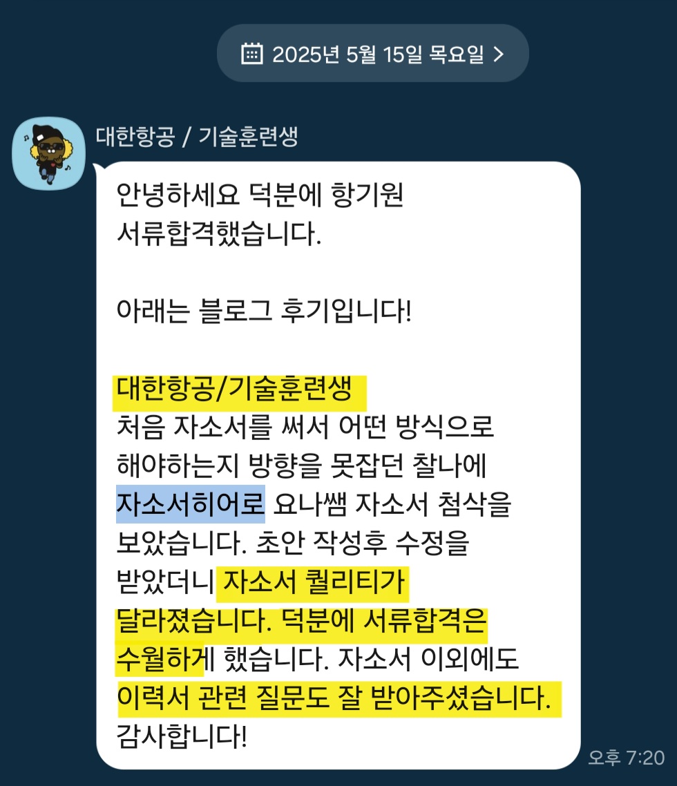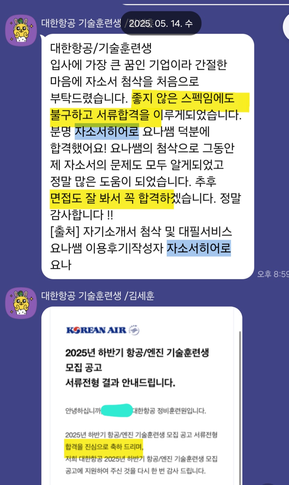 대한항공 하계인턴 자기소개서도 기업 분석부터 문항별 구성까지 맞춤으로 제작해 드리고 있습니다. 상담 및 첨삭이 필요하신 분은 아래 채널로 문의 주세요.