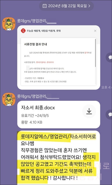 저는 롯데슈퍼와 롯데손해보험 지원자 여러분이 서류 전형을 통과하고,