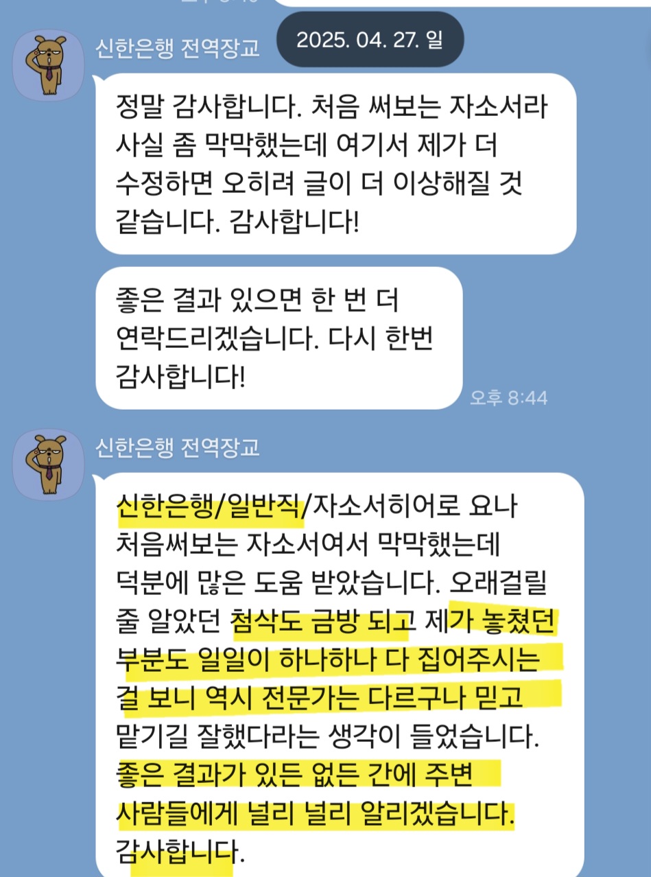 24시간 이내 신한은행 합격을 위한 맞춤 자기소개서 첨삭 서비스를 제공해드립니다.