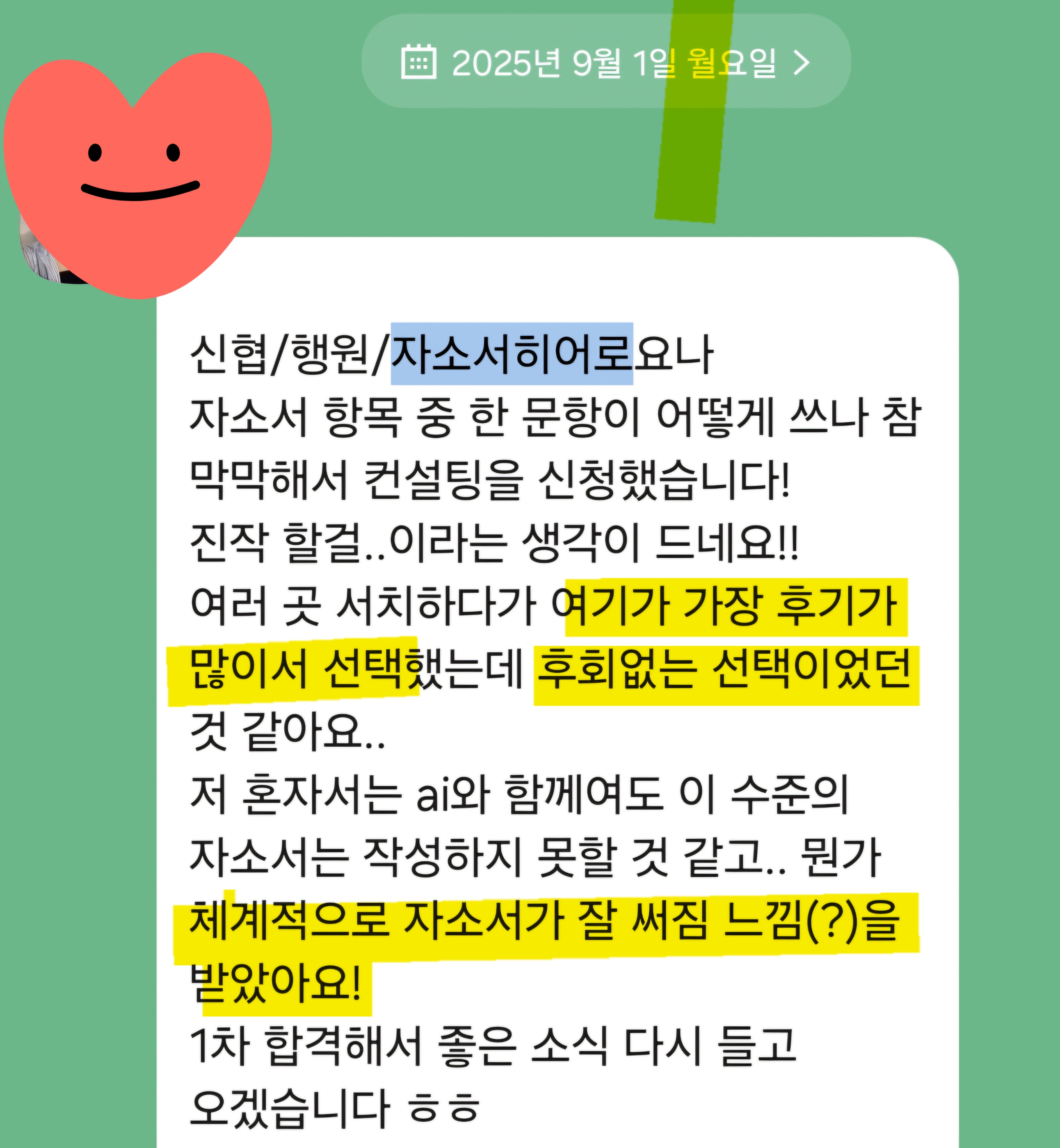 매해 3,000명 이상의 의뢰인을 합격으로 이끌고 있는 취업 전문 컨설턴트, 자소서히어로 요나입니다.