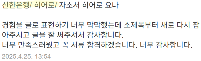 자소서히어로는 지난 10년간 95% 이상의 서류 합격률을 유지하며 수많은 신한은행 및 금융권 자기소개서를 컨설팅해왔습니다. 단순한 문장 교정이 아닌, 기업의 평가 기준과 인재상을 분석한 전문 맞춤형 자소서 작성을 도와드립니다.
