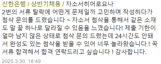 24시간 이내 신한은행 합격을 위한 맞춤 자기소개서 첨삭 서비스를 제공해드립니다.