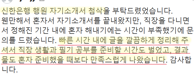 - 크몽 만족도 5.0 / 3,000건 이상의 압도적 후기 - 내가 원하는 자소서로 만들어드립니다. - 무스펙, 무경력자도 서류합격가능합니다. - 온가족을 합격시킨 자소서 첨삭전문가 의뢰인분의 합격을