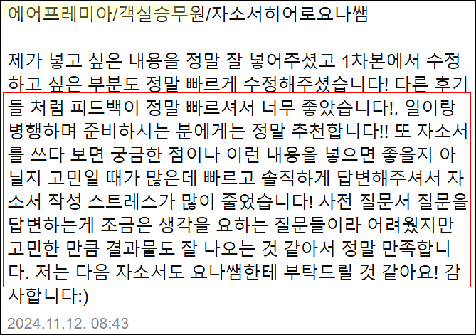 24시간 이내 에어로케이항공 서류 합격을 위한 맞춤 자기소개서 첨삭 대행 서비스를 제공해 드립니다.