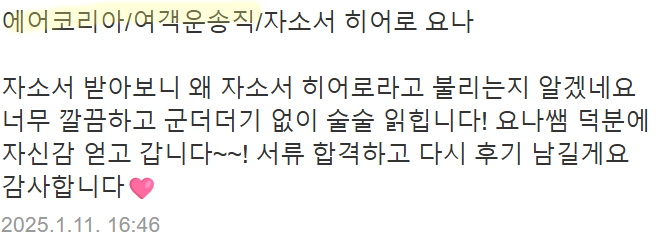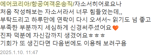에어코리아는 매년 자기소개서 항목이 크게 바뀌지 않기 때문에, 한 번 제대로 준비해 두면 앞으로의 채용에도 유리합니다. 특히 서류전형은 면접과 직결되기 때문에, 첫 단추인 자기소개서를 전략적으로 작성하는 것이 매우 중요합니다.