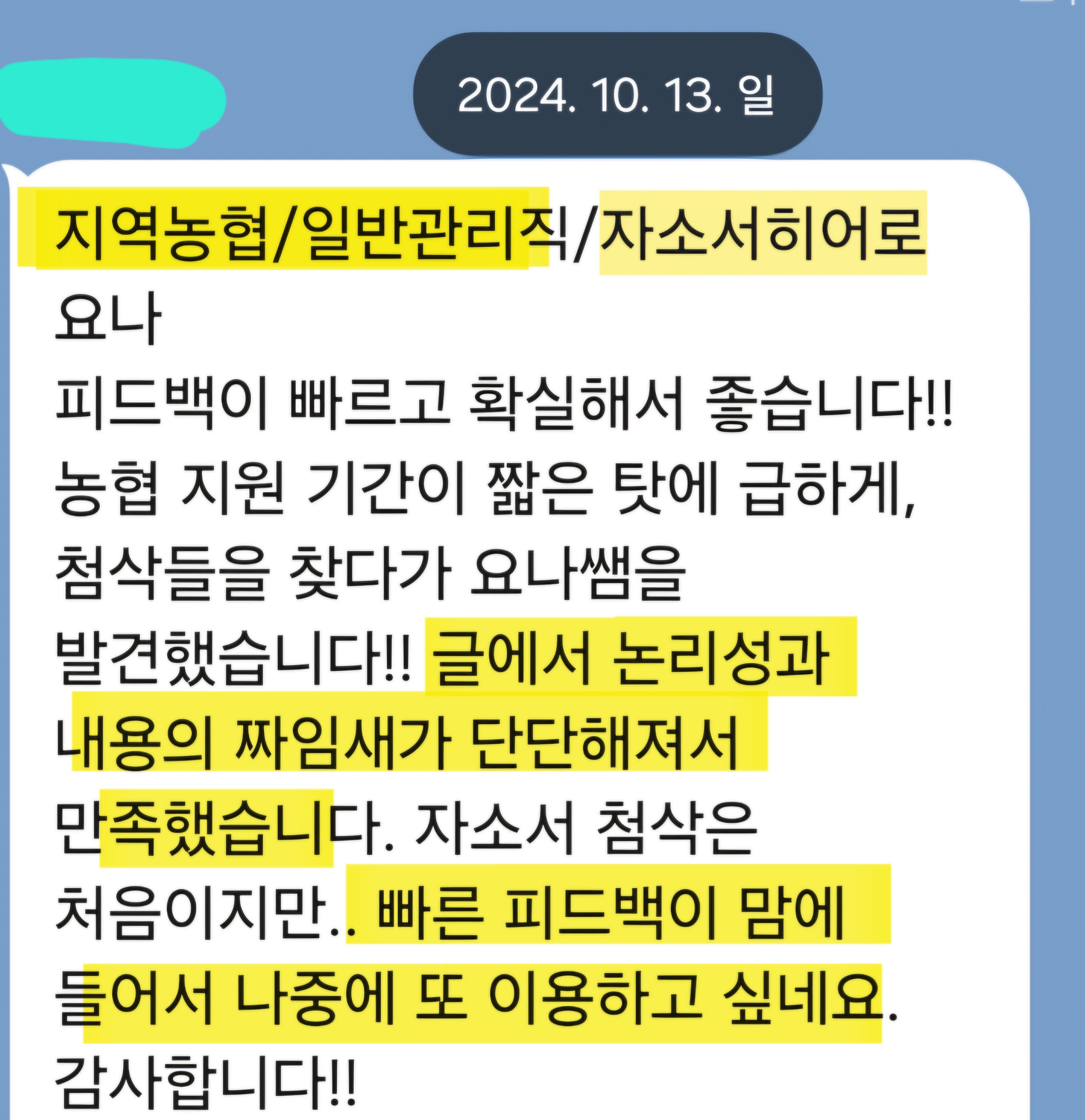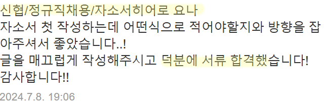- 빠르고 정확한 첨삭과 피드백: "빠른 피드백 덕분에 무사히 지원할 수 있었습니다."