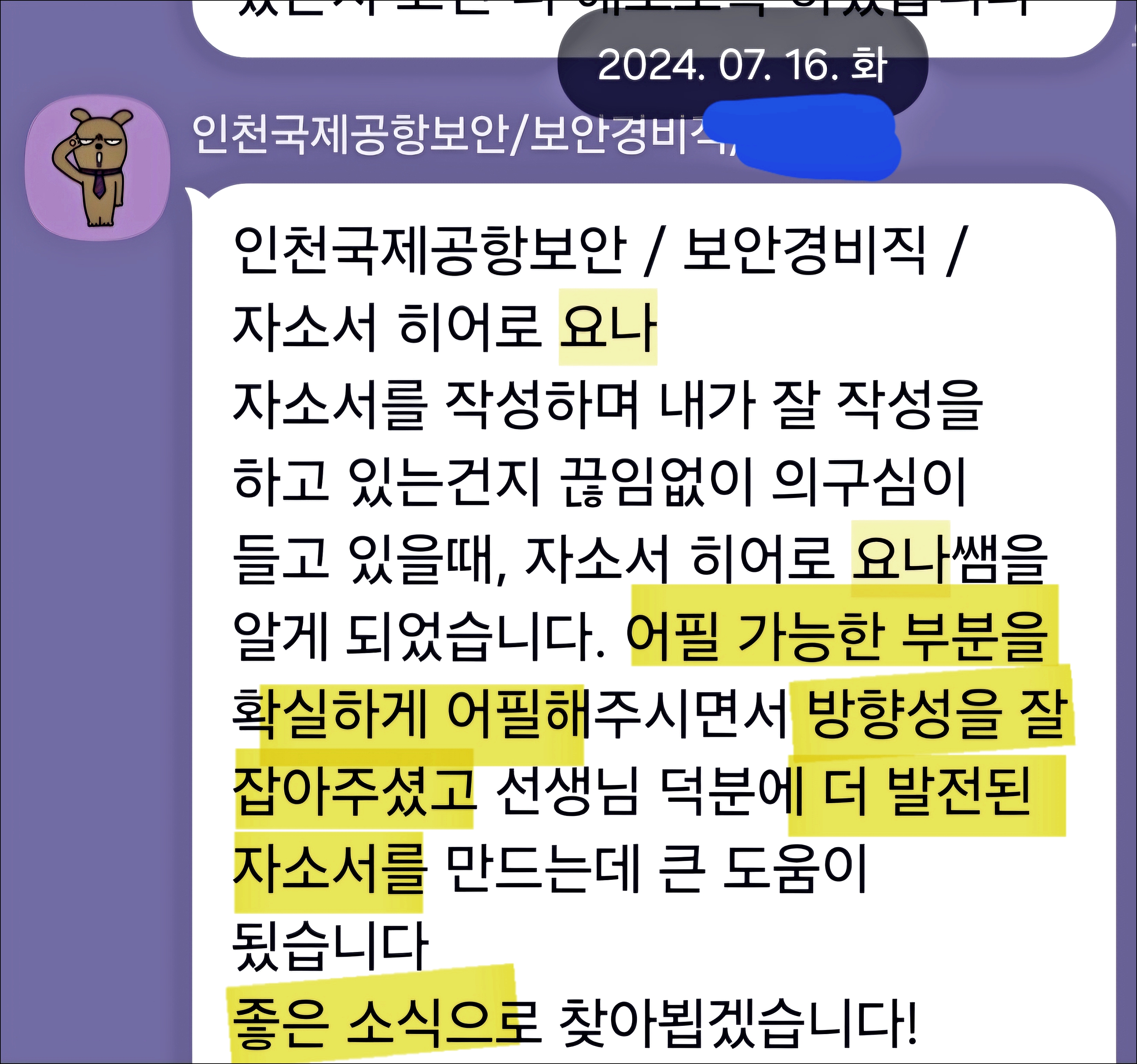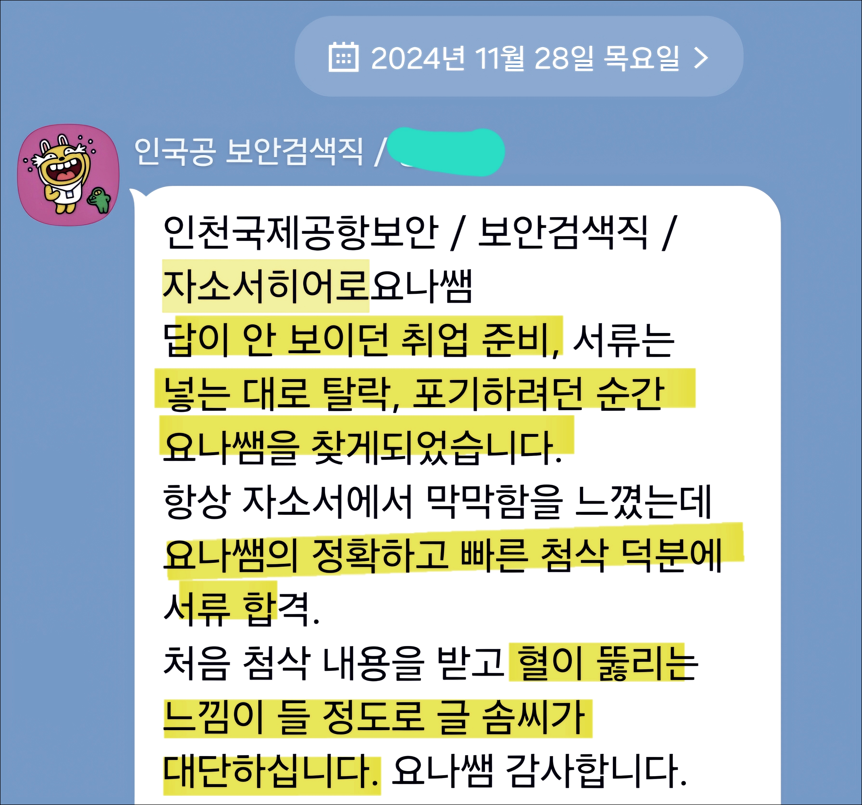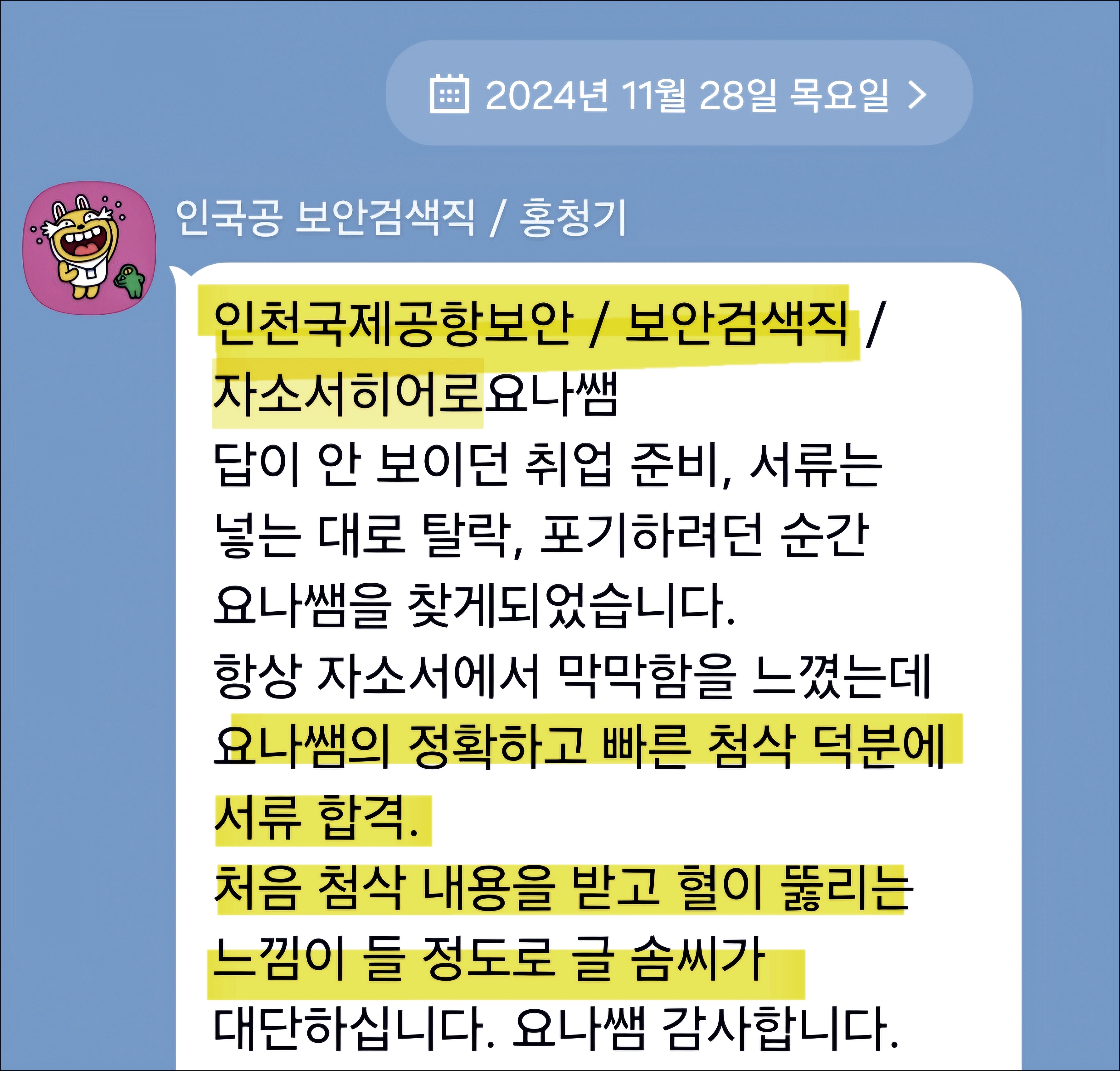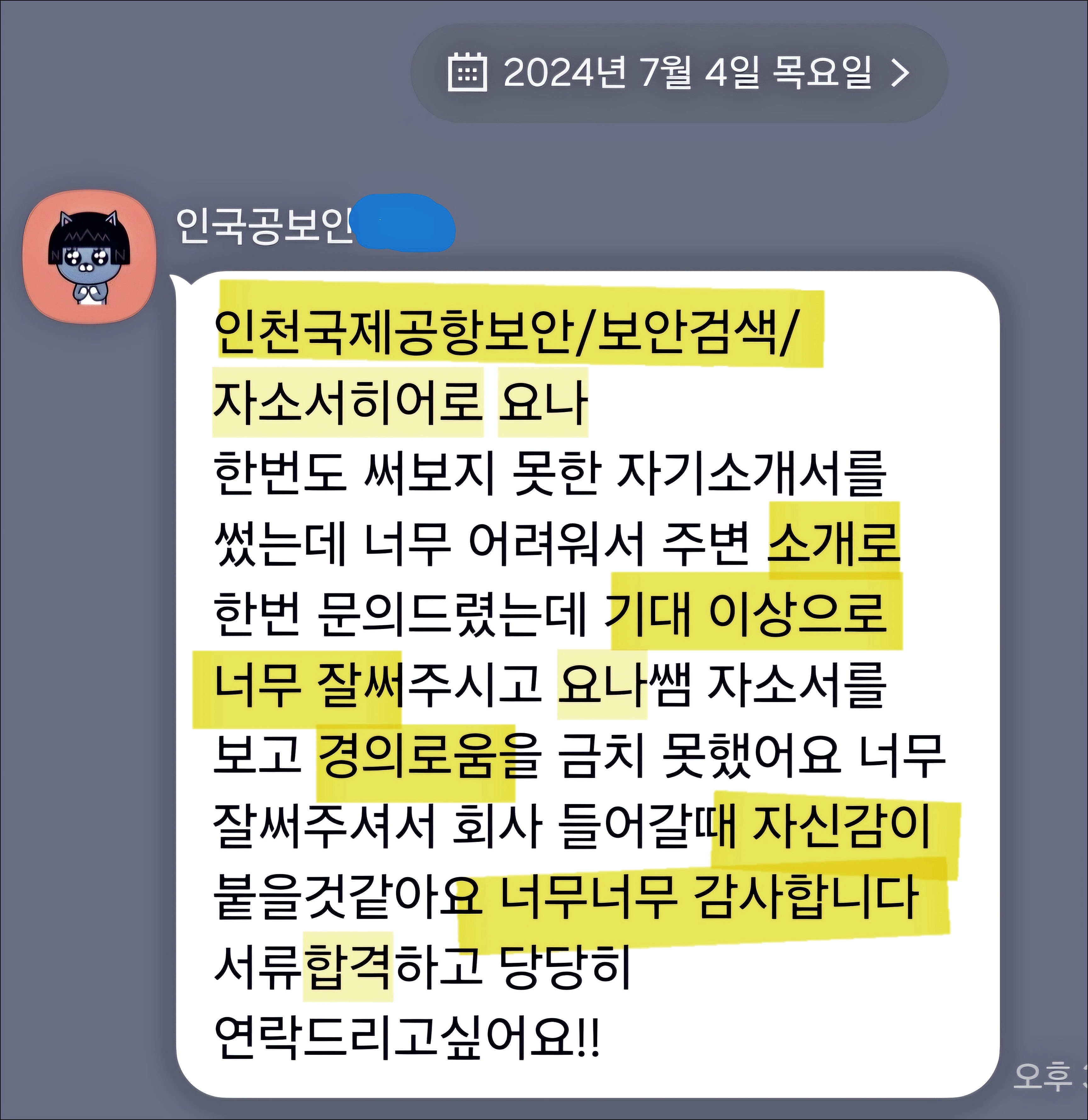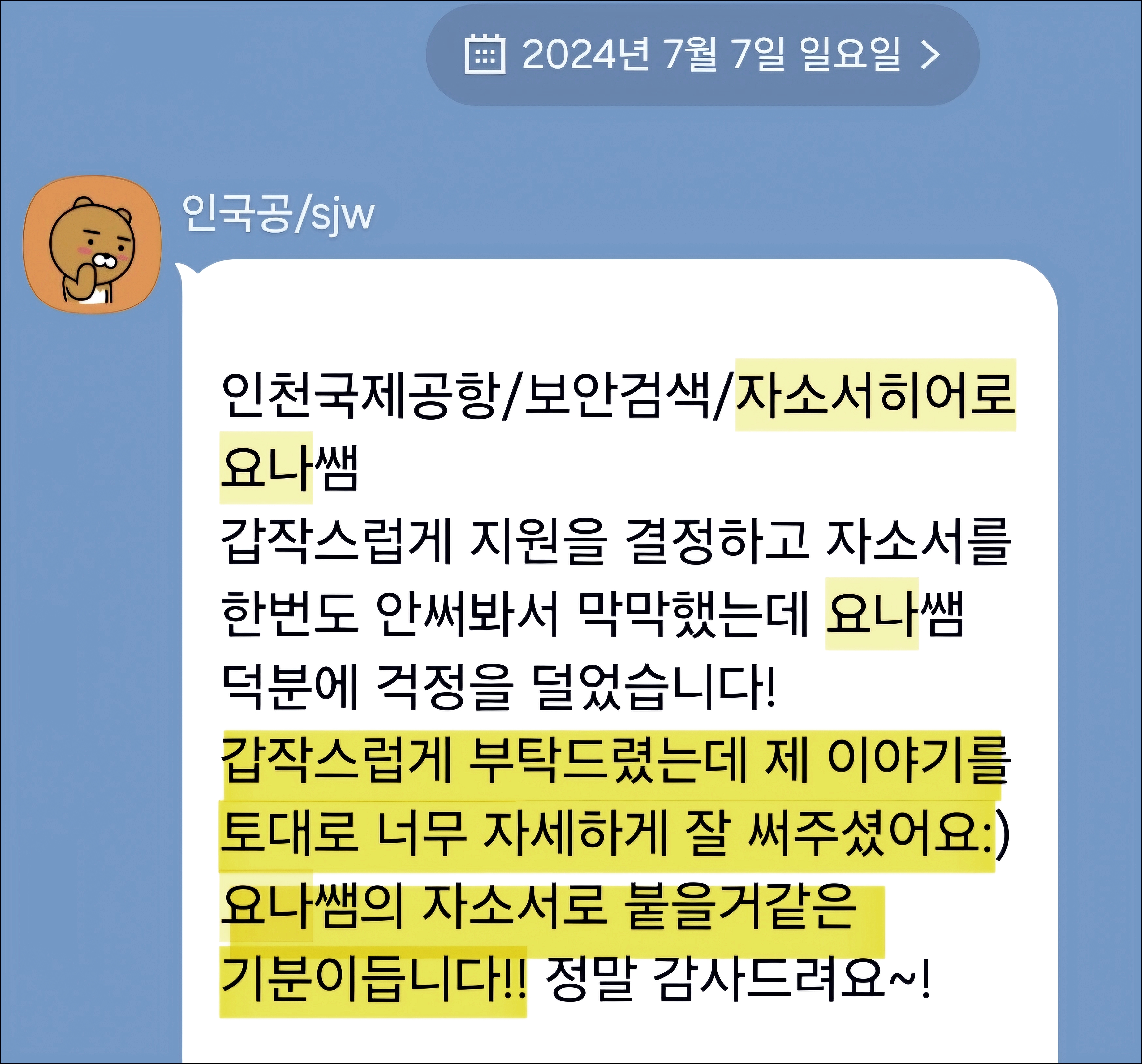 궁금한 점이 있으시거나 상담을 원하시면 아래 채널로 문의 주세요. 24시간 내 인국공 합격을 위한 자기소개서를 완성해드립니다.