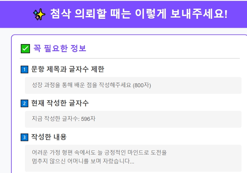좋은 자기소개서는 단순한 스펙 나열이 아닌, 문항 의도에 맞춘 맞춤 설계가 필요합니다. 기업과 기관이 원하는 평가 기준을 분석하고, 지원자의 경험과 강점을 근거 있는 스토리로 재구성해야 합격 가능성을 높일 수 있습니다.