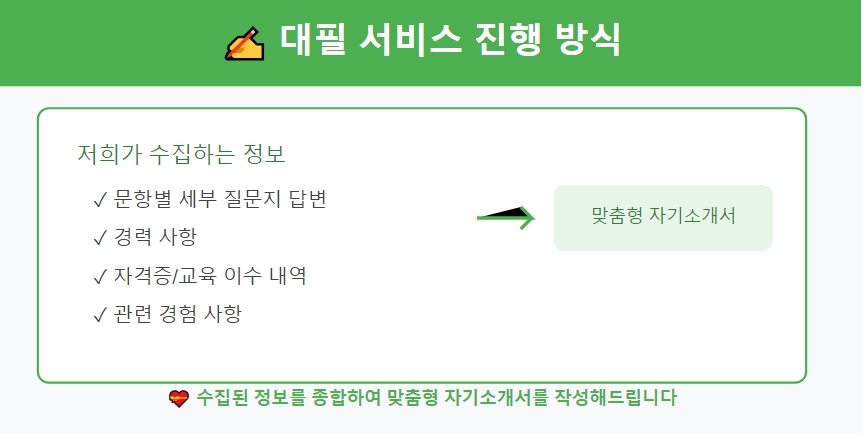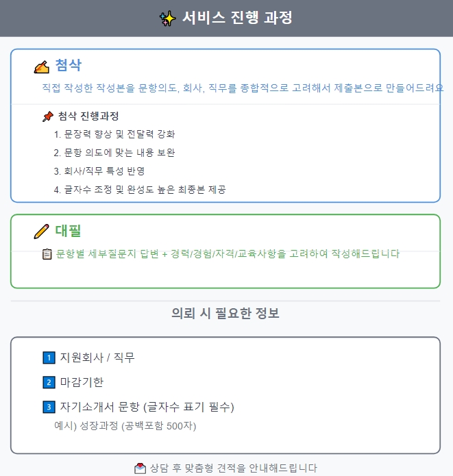 24시간 내 서류 합격을 위한 맞춤형 자기소개서 첨삭·대필 서비스를 신속 정확히 제공합니다.