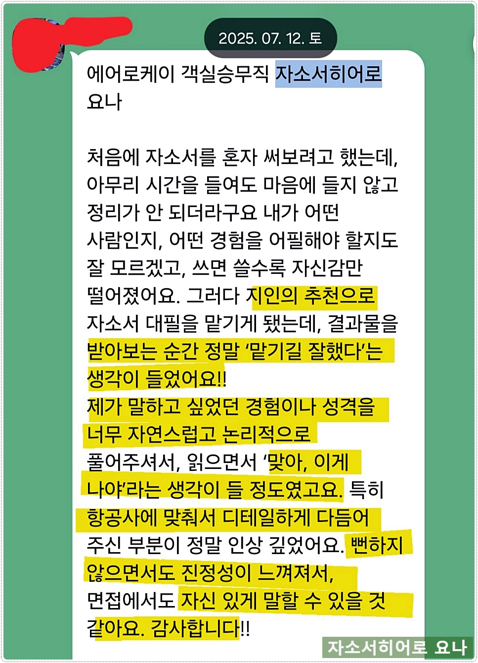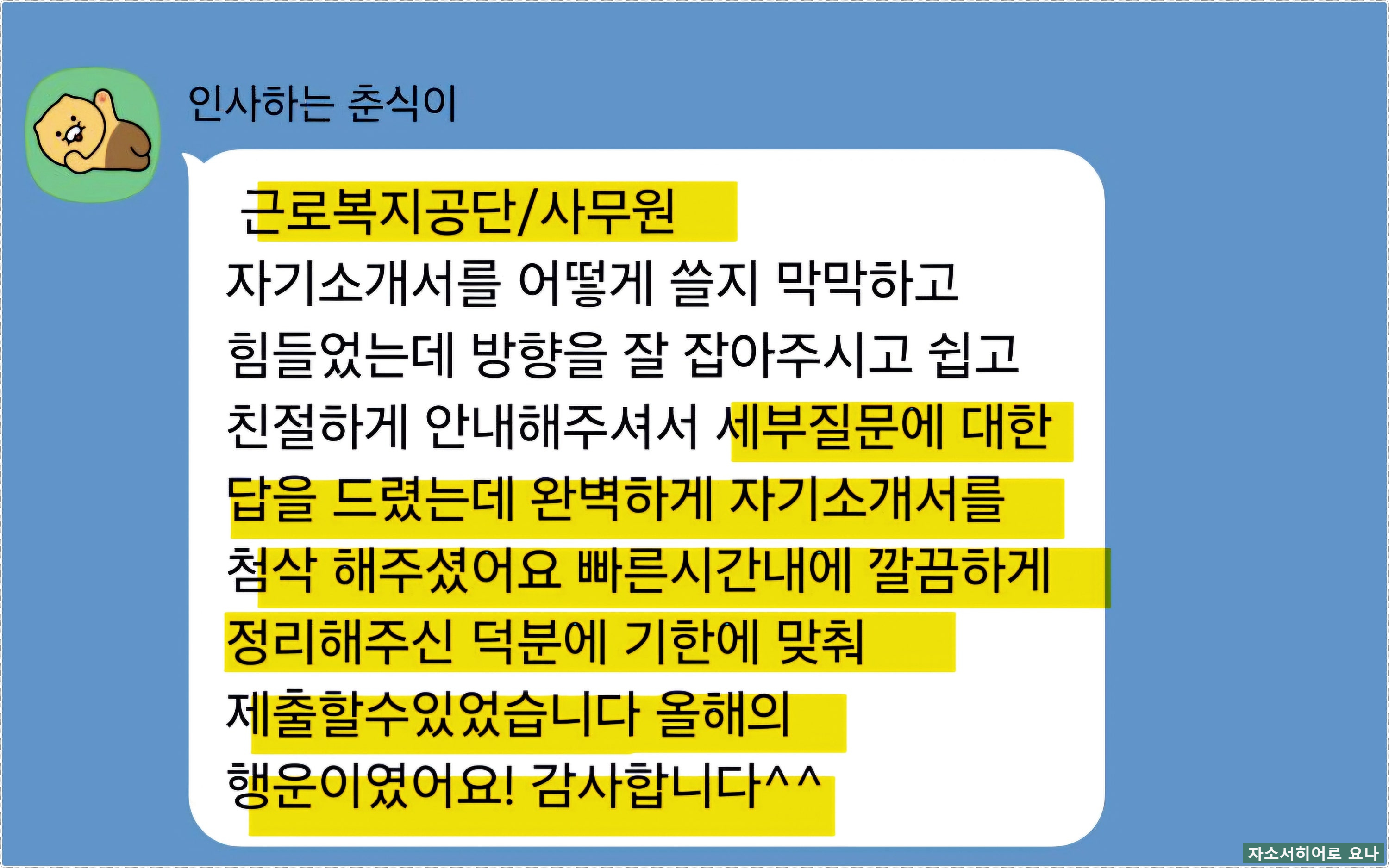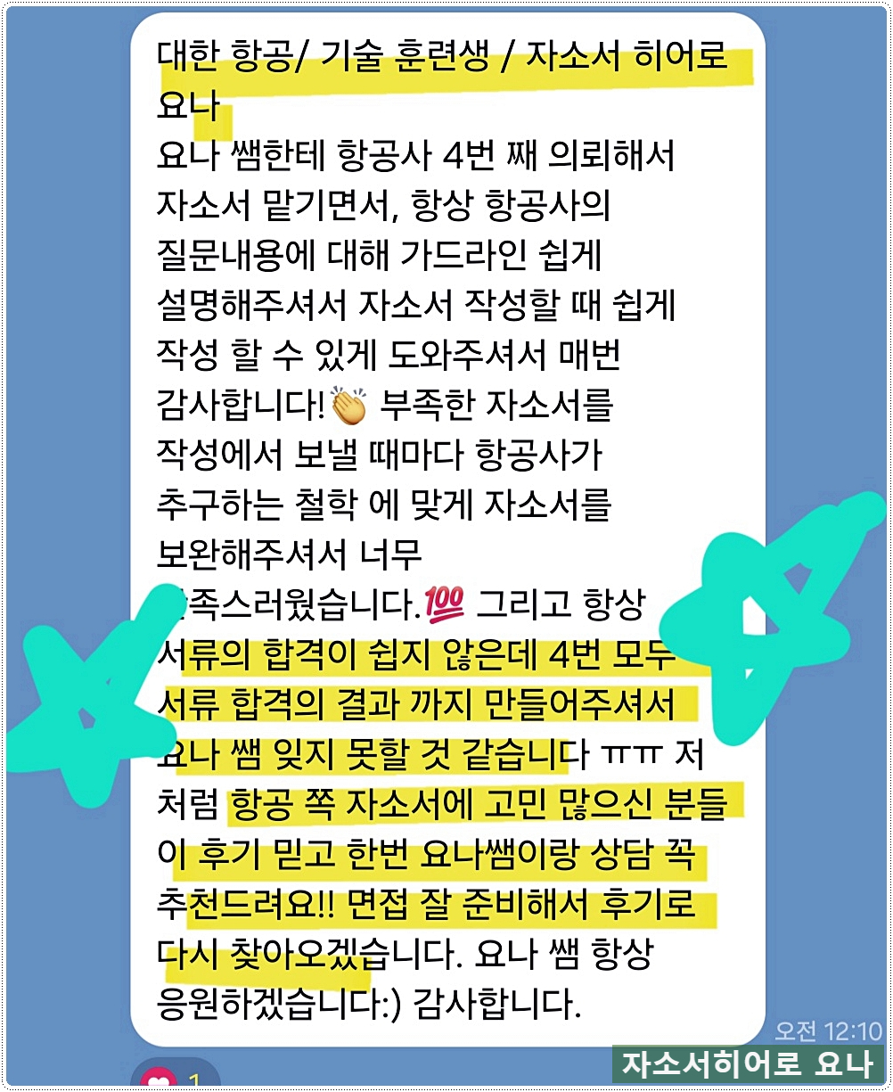 서류 합격률 95% 이상을 기록하며 매달 50명 이상의 의뢰인 자기소개서를 첨삭, 대필하고 있는 자소서히어로 요나입니다.