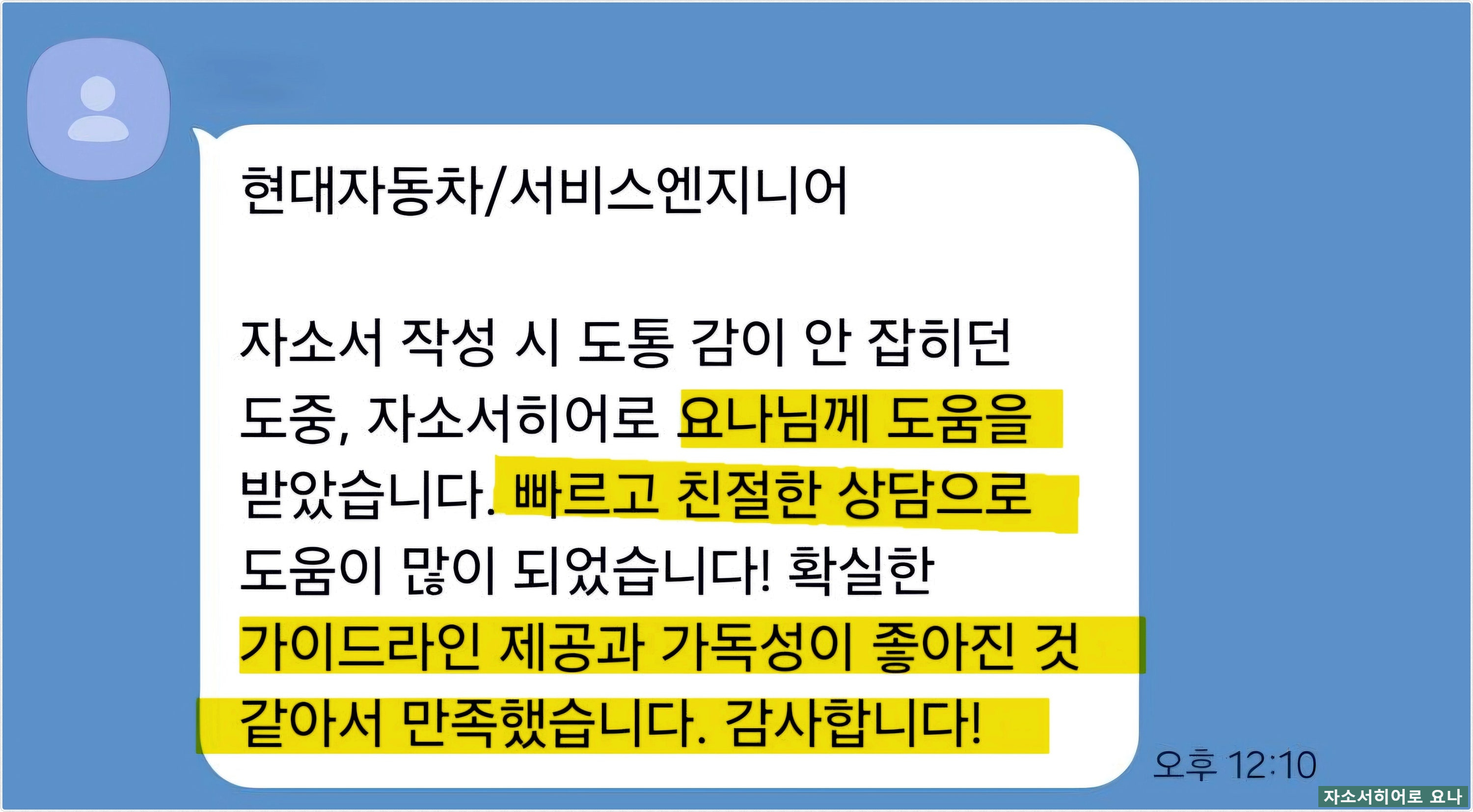 자소서히어로 요나의 첨삭은 단순히 글을 돋보이게 하는 것이 아니라, 점수를 받을 수 있는 글로 재구성하는 것이 핵심입니다. 부족한 경험도 살아나며, 짧은 시간 내에 논리적이고 가독성 높은 자기소개서를 완성할 수 있습니다.