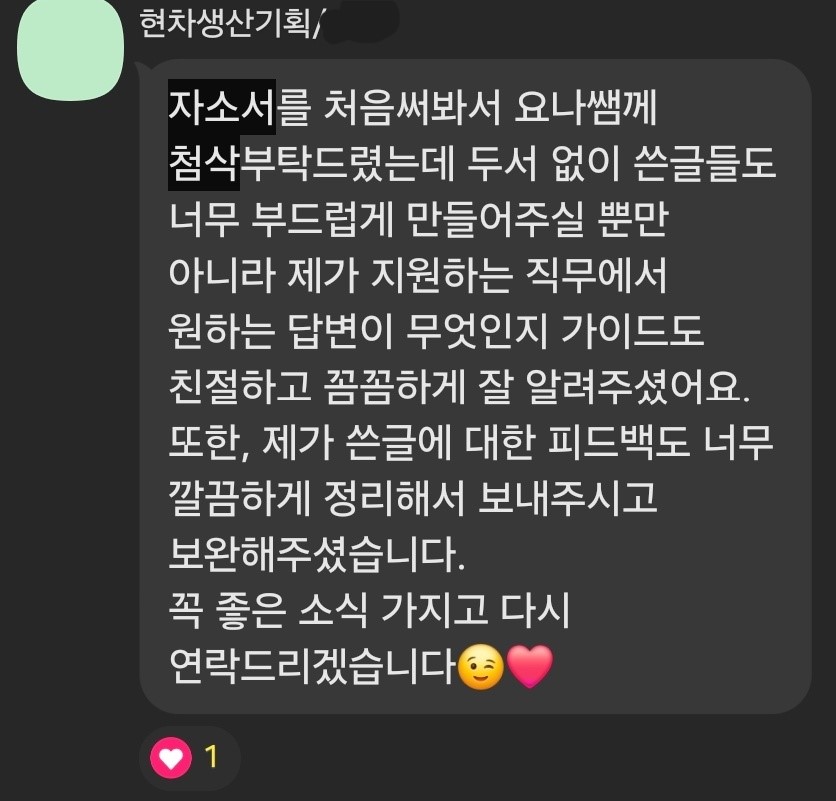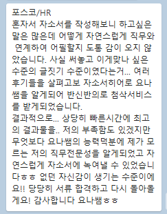저와 함께 자소서를 작성한 많은 분들이 기쁜 합격 소식을 전해 주셨습니다. 그 중 일부 후기를 소개해 드립니다.