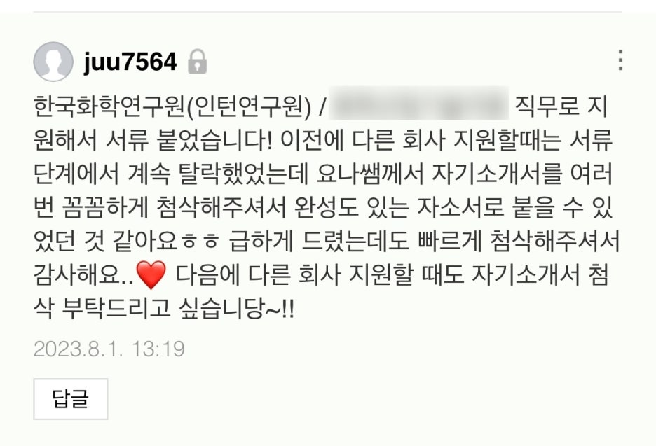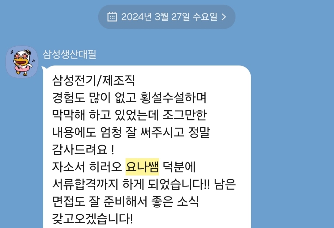 저와 함께한 많은 분들이 저의 첨삭을 통해 서류 합격의 기쁨을 누렸습니다.