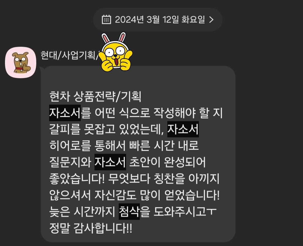 - 김*지 님 (대기업 합격): "처음에는 제 경험을 어떻게 풀어내야 할지 막막했어요. 그런데 자소서히어로의 꼼꼼한 첨삭과 피드백 덕분에, 제 이야기로 설득력 있는 자소서를 완성할 수 있었습니다. 결국 원하던 대기업에 합격할 수 있었어요. 정말 감사드립니다!"