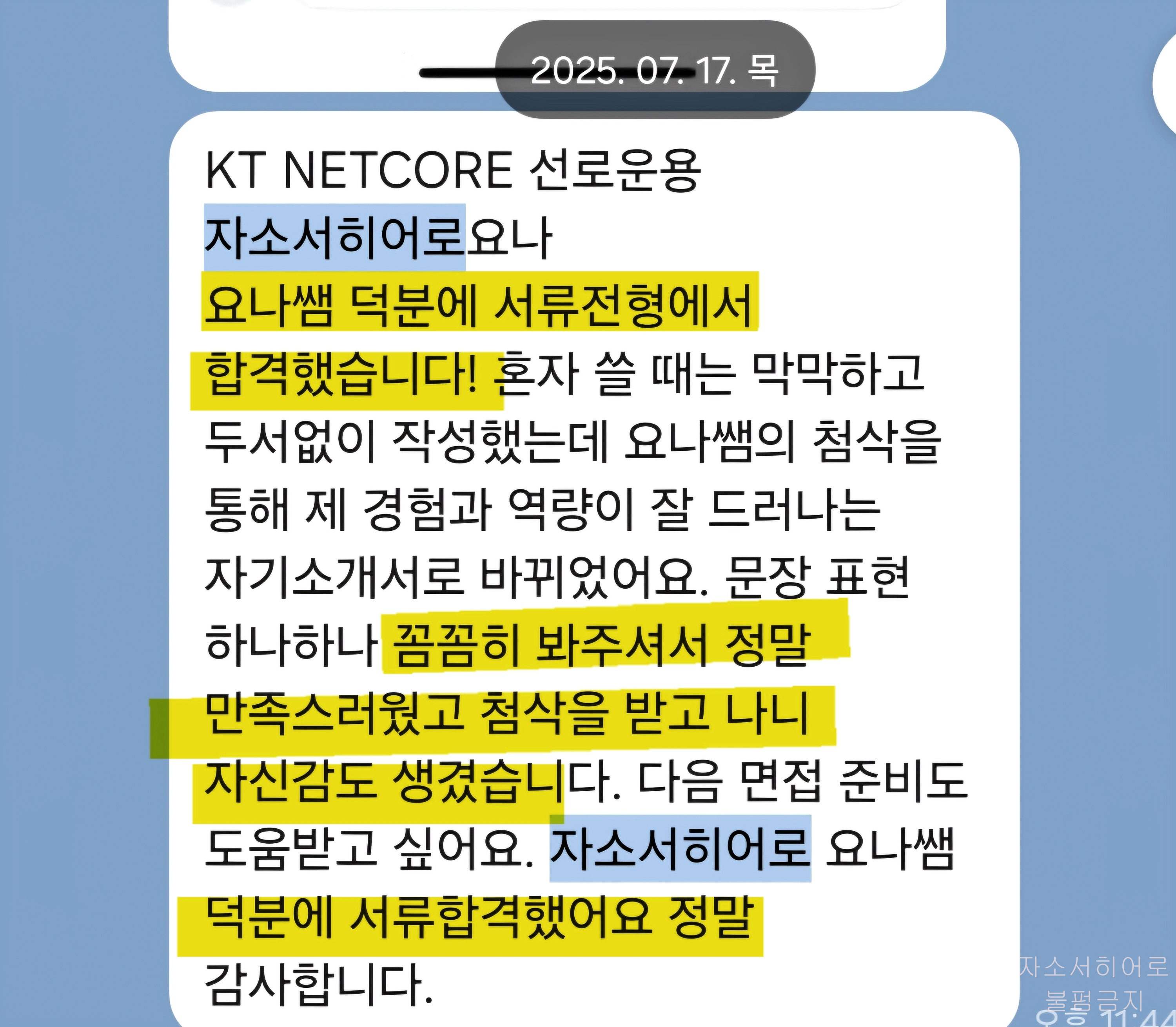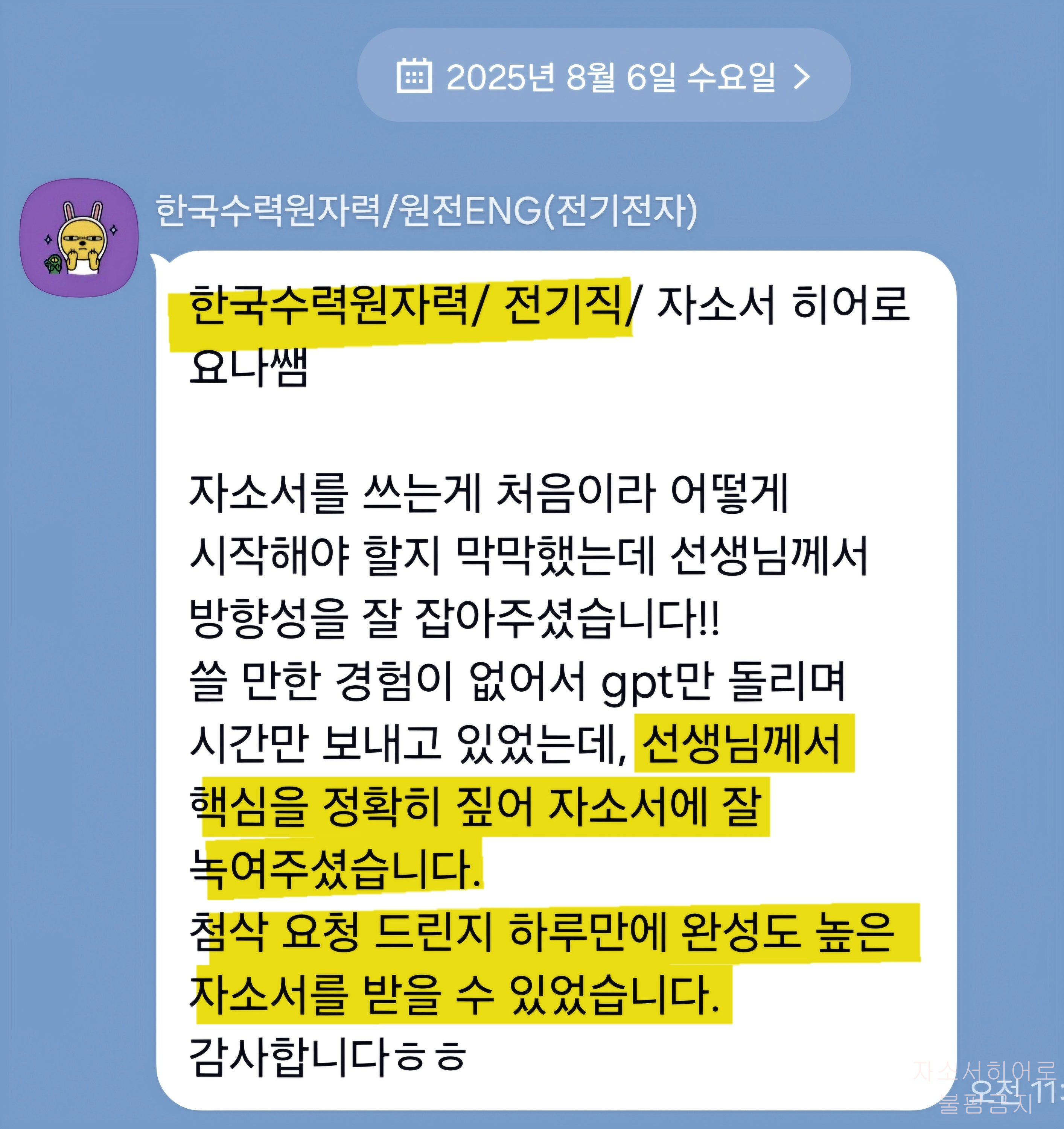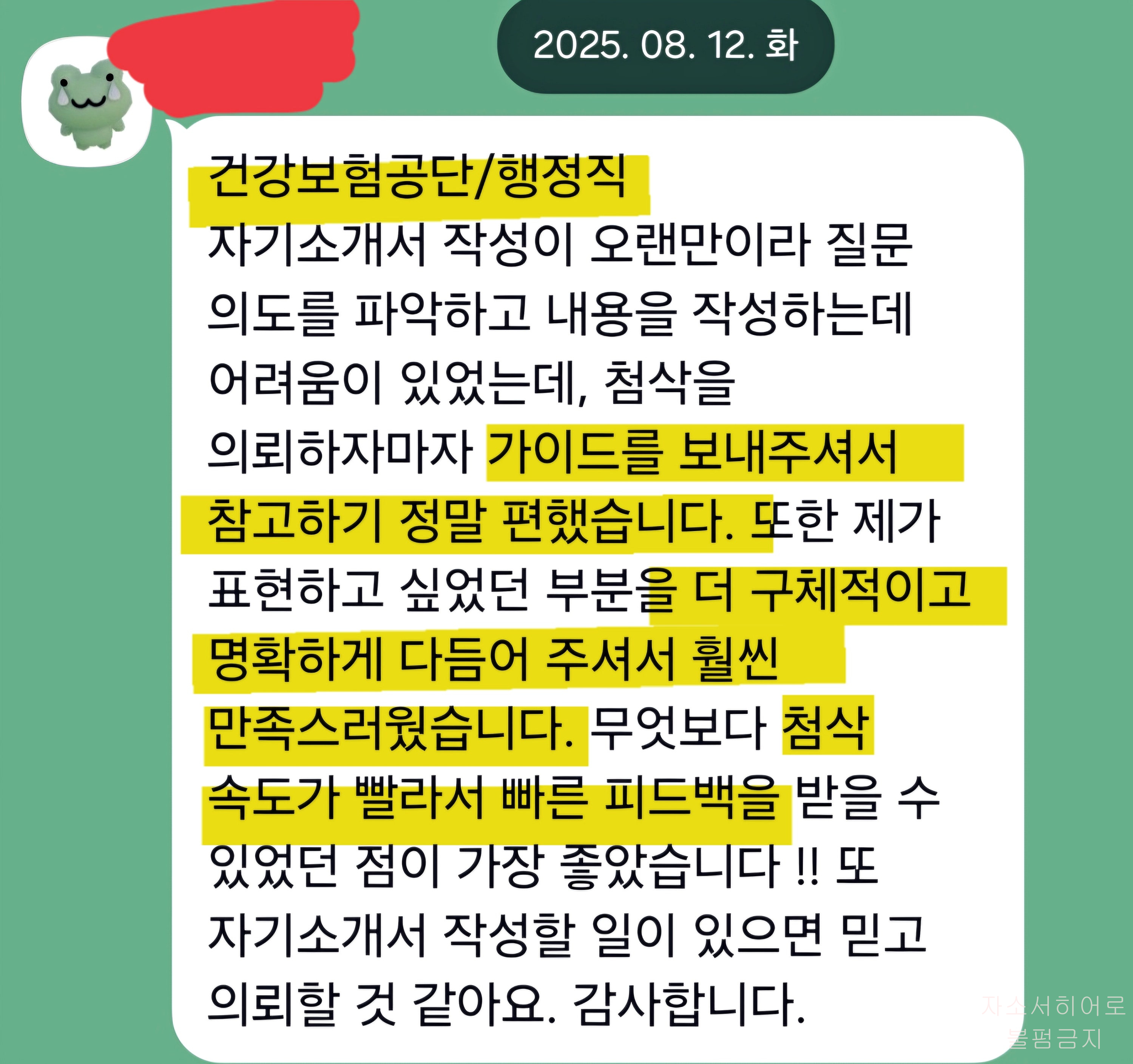 맞춤형 자기소개서 첨삭으로 서류 합격을 보장합니다. 만족도 5.0, 당일 완성 가능!