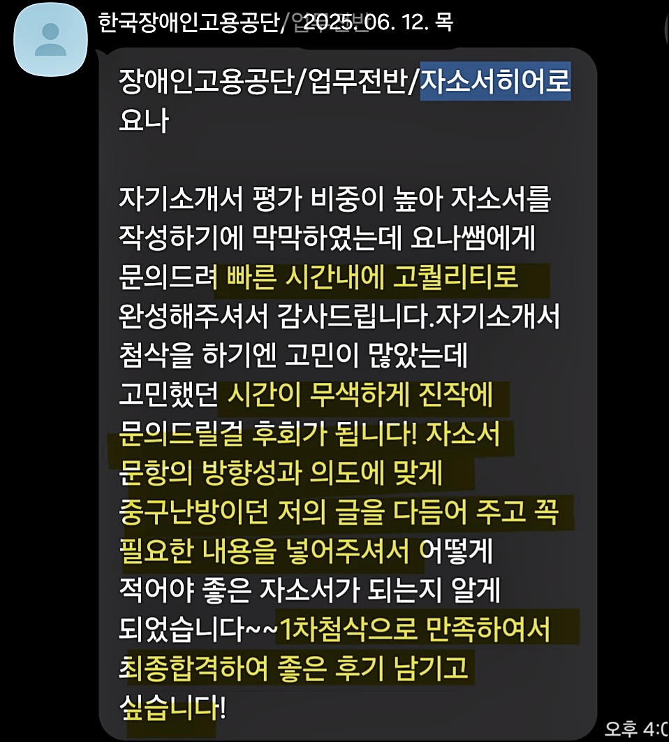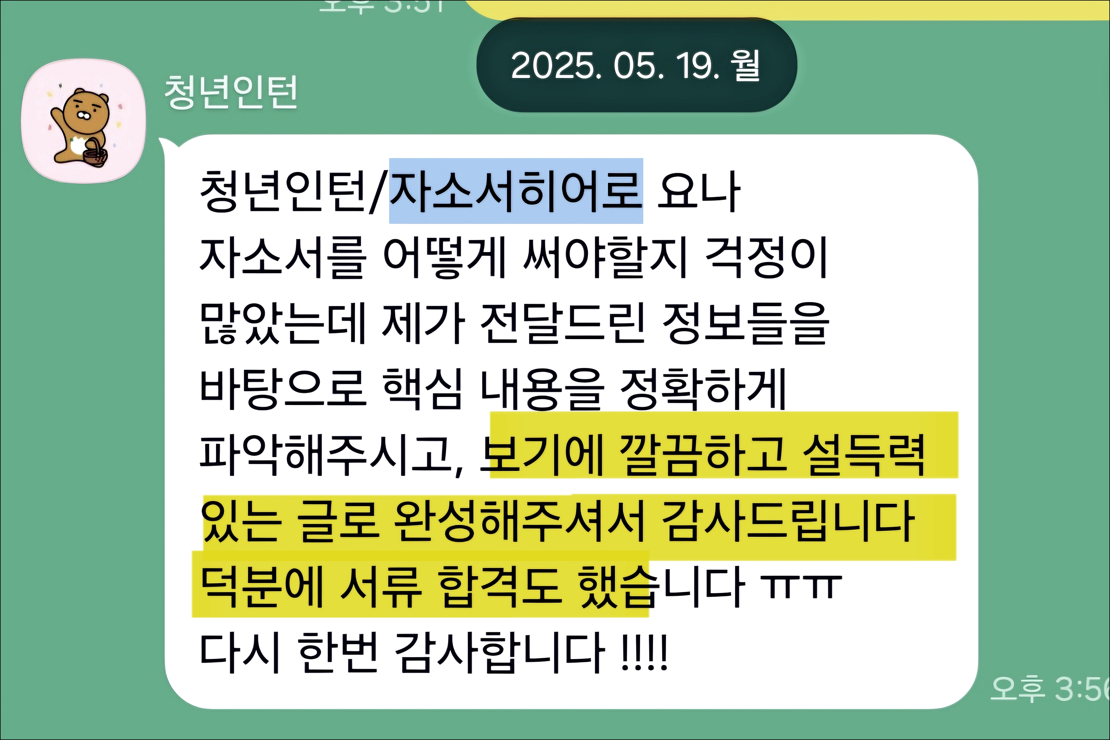 자기소개서에 어떤 내용을 넣으면 좋을지, 어떤 흐름으로 써야 하는지 어려움을 겪고 계시다면 꼭 참고해 주세요. 그리고 여전히 혼자 준비하기 버겁다면, 아래 채널로 상담을 요청해 주세요. 여러분의 경험과 강점을 기반으로 한 맞춤 자기소개서를 함께 만들어 드립니다.