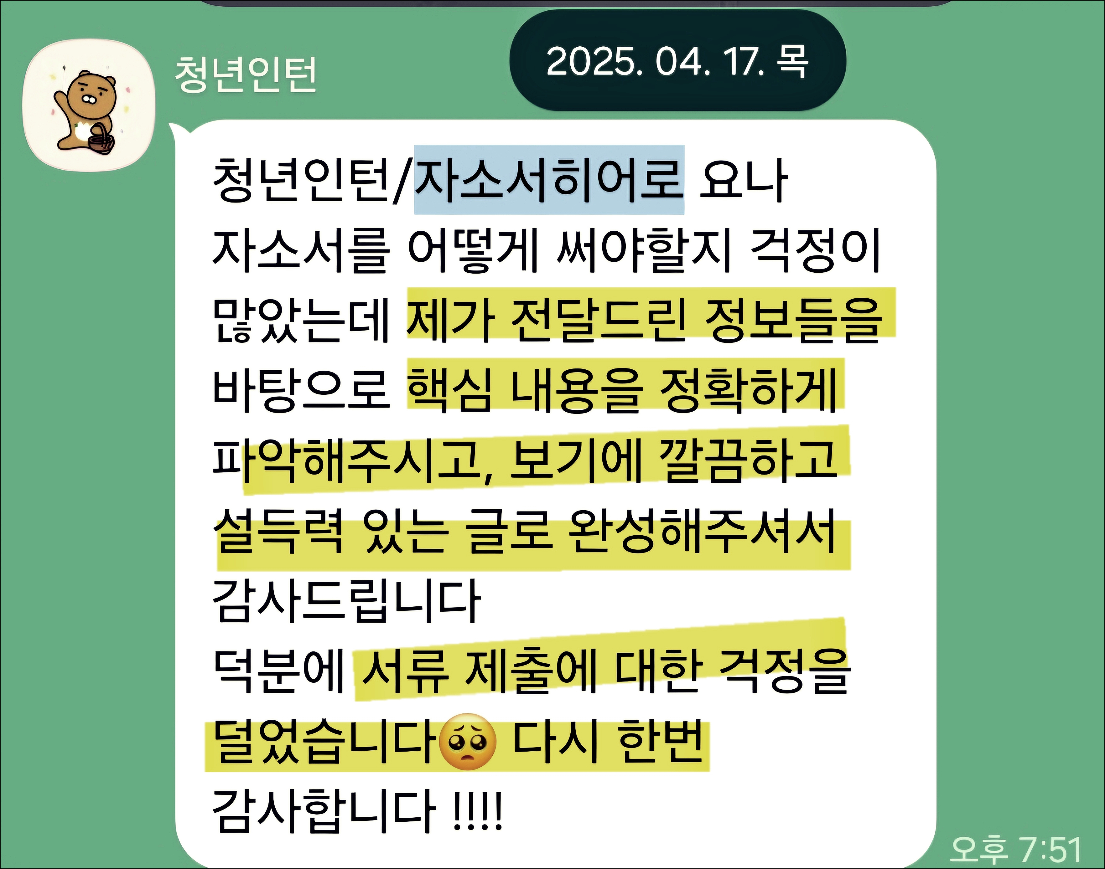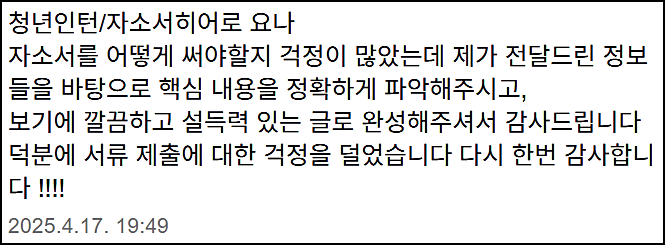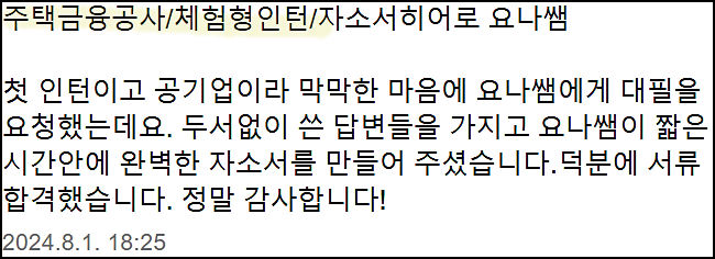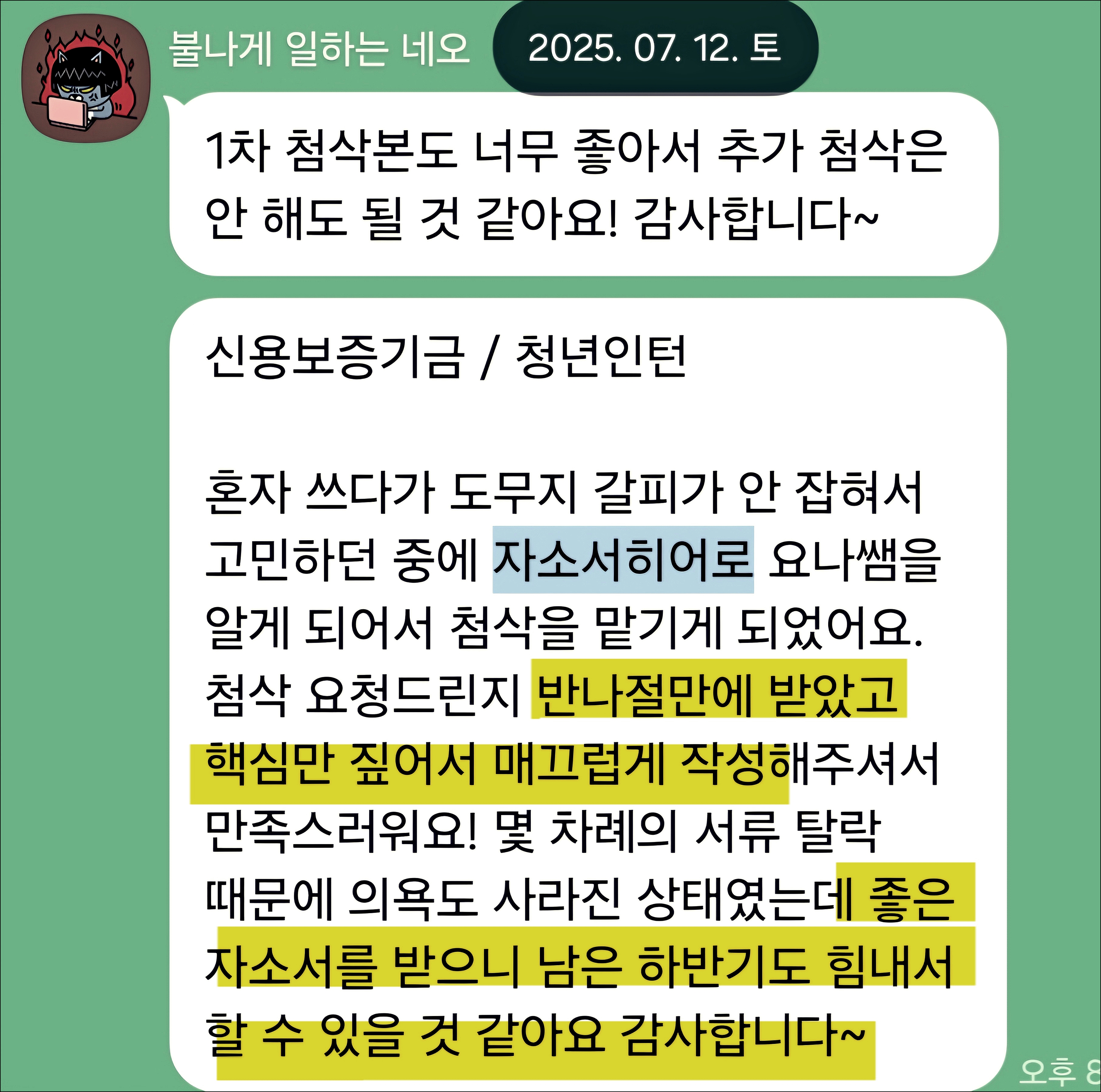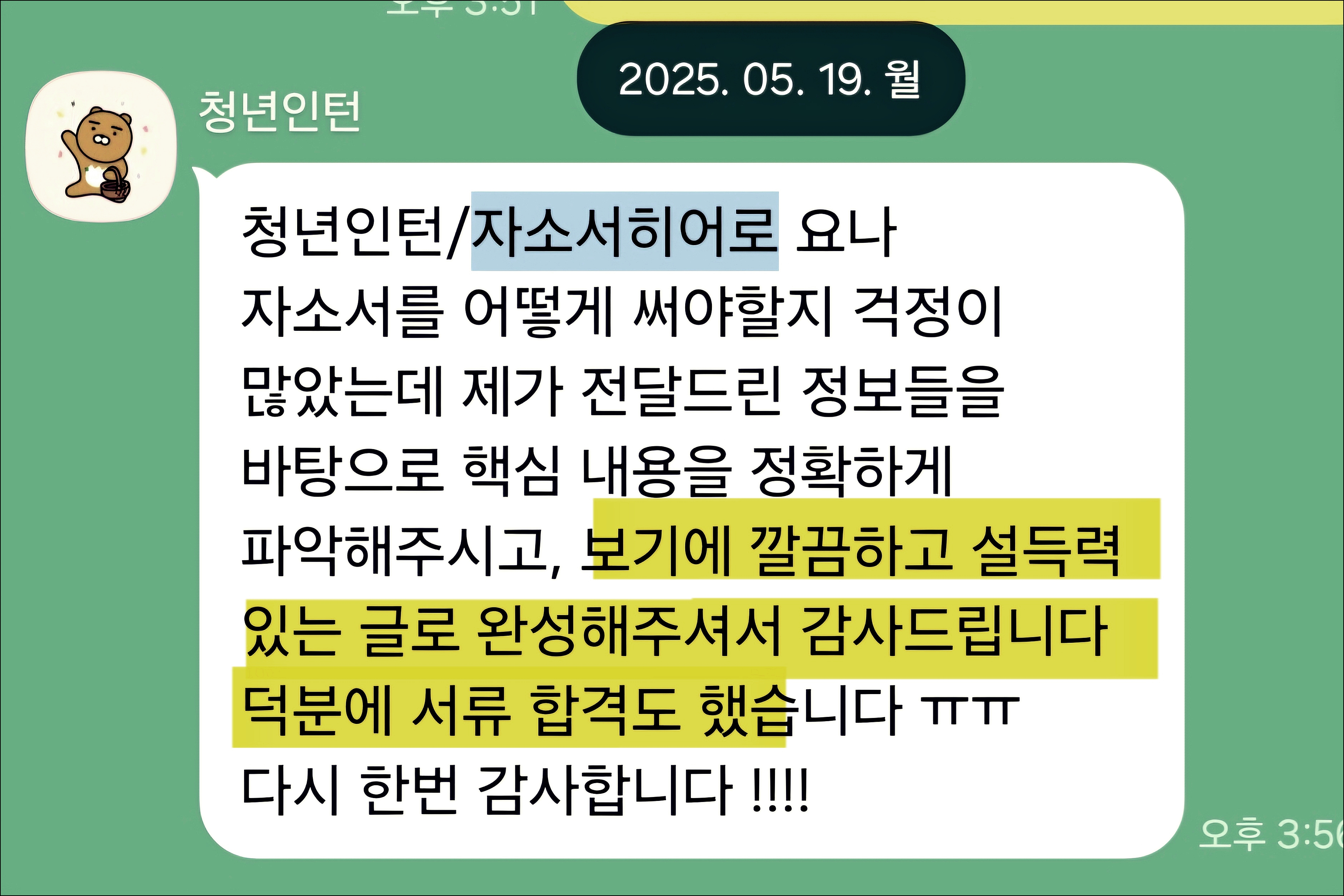맞춤형 자기소개서 첨삭으로 서류 합격을 보장합니다. 만족도 5.0, 당일 완성 가능!