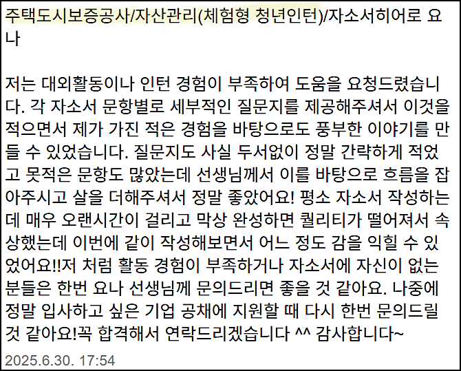 | 자기소개서 첨삭부터 대필까지, 합격 가능한 자소서 만드는 방법 (0) | 2025.12.01 |