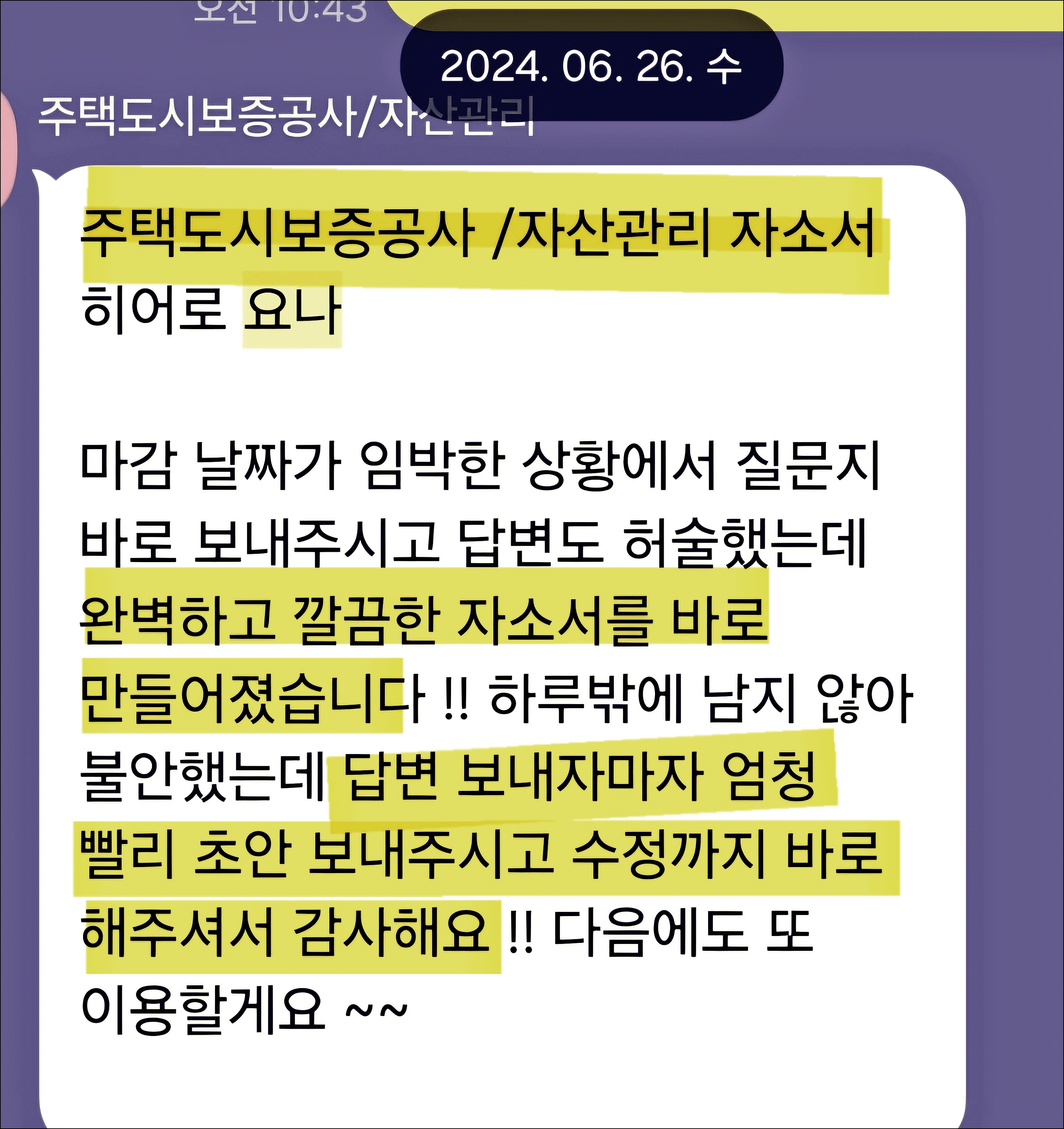 24시간 내 주택도시보증공사 인턴 합격을 위한 맞춤 자기소개서 첨삭 서비스를 제공해 드립니다.