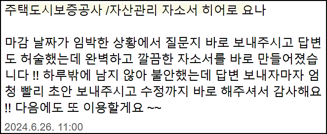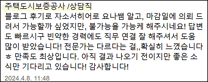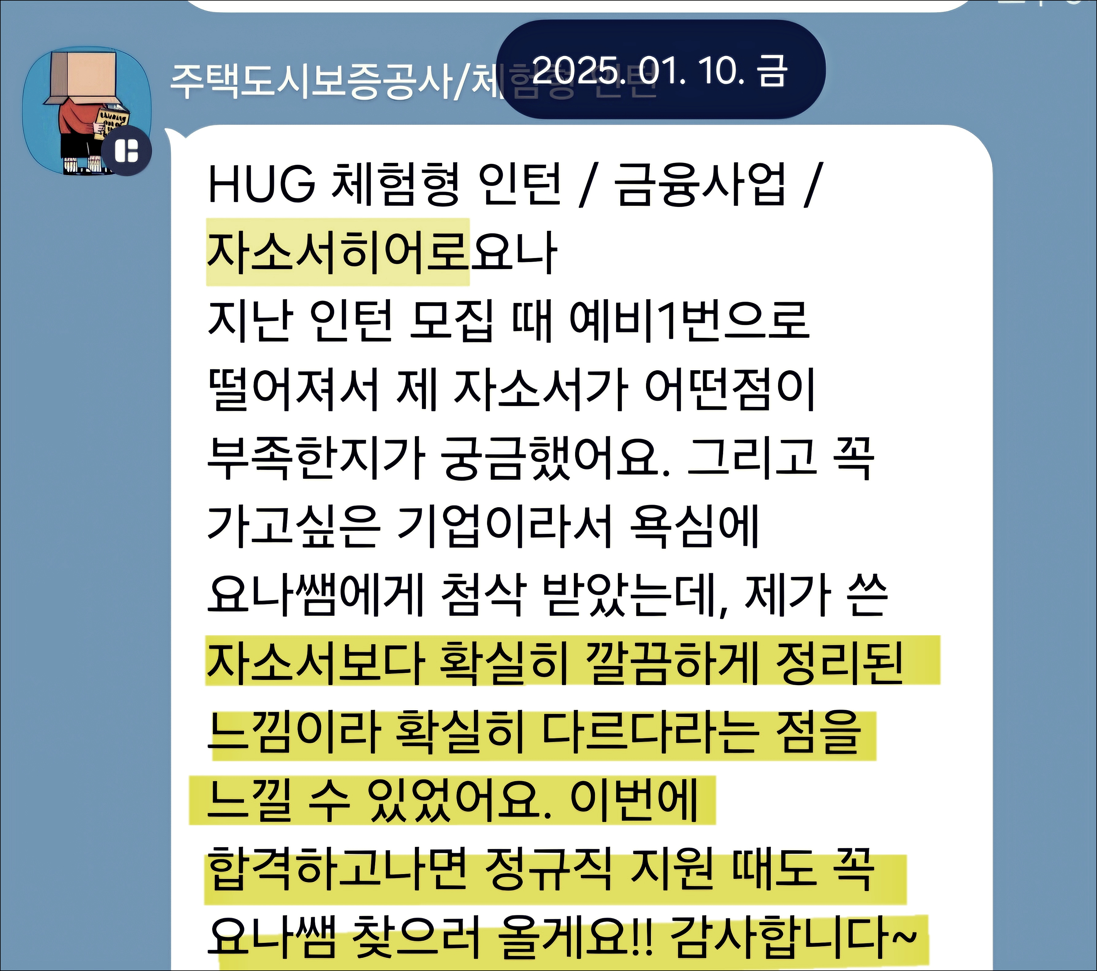 자소서히어로는 오랜 기간 HUG 지원자들을 컨설팅해온 경험을 바탕으로, 기관 인재상·직무 특성에 맞춘 맞춤 자기소개서를 제작해 드리고 있습니다.