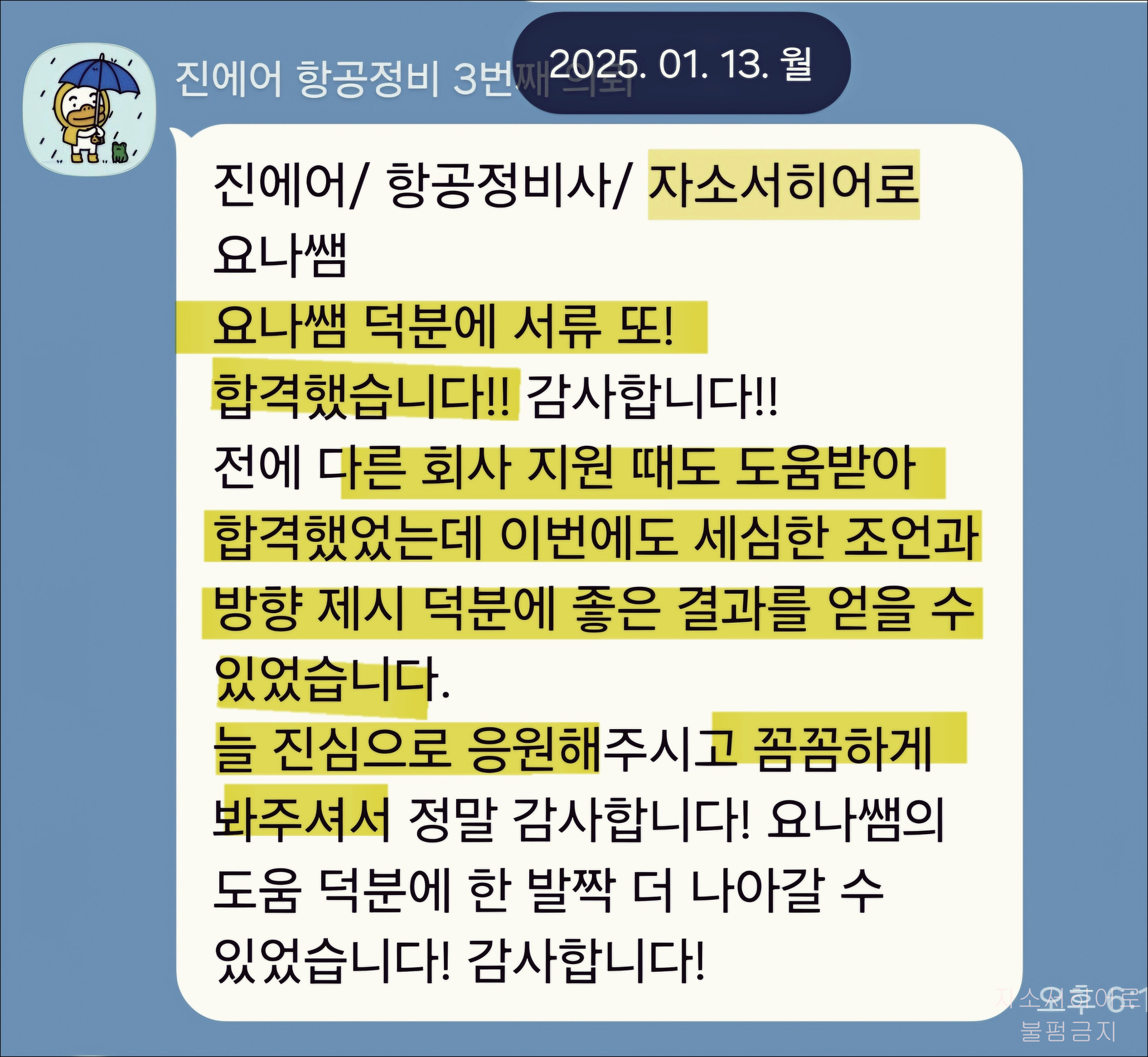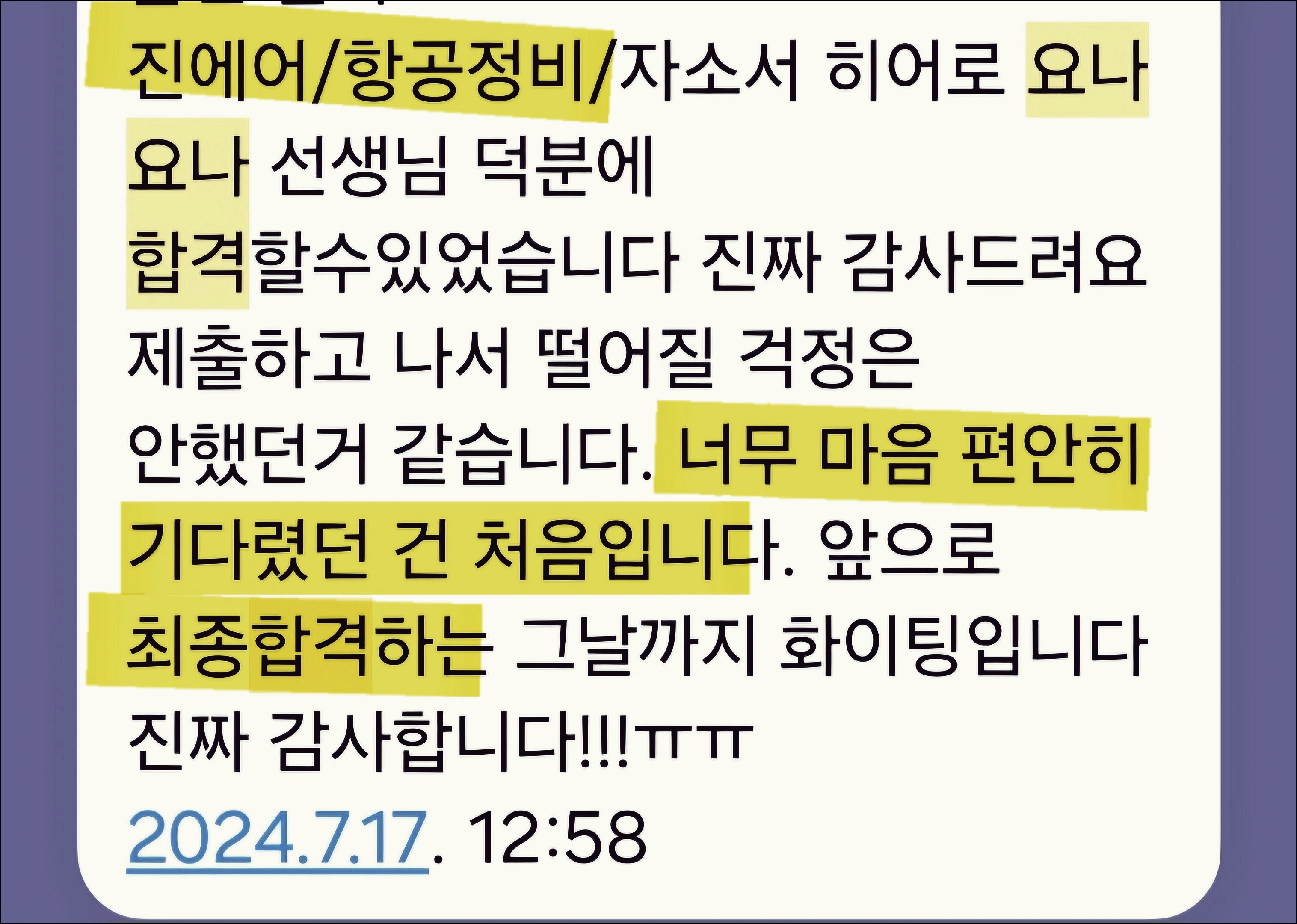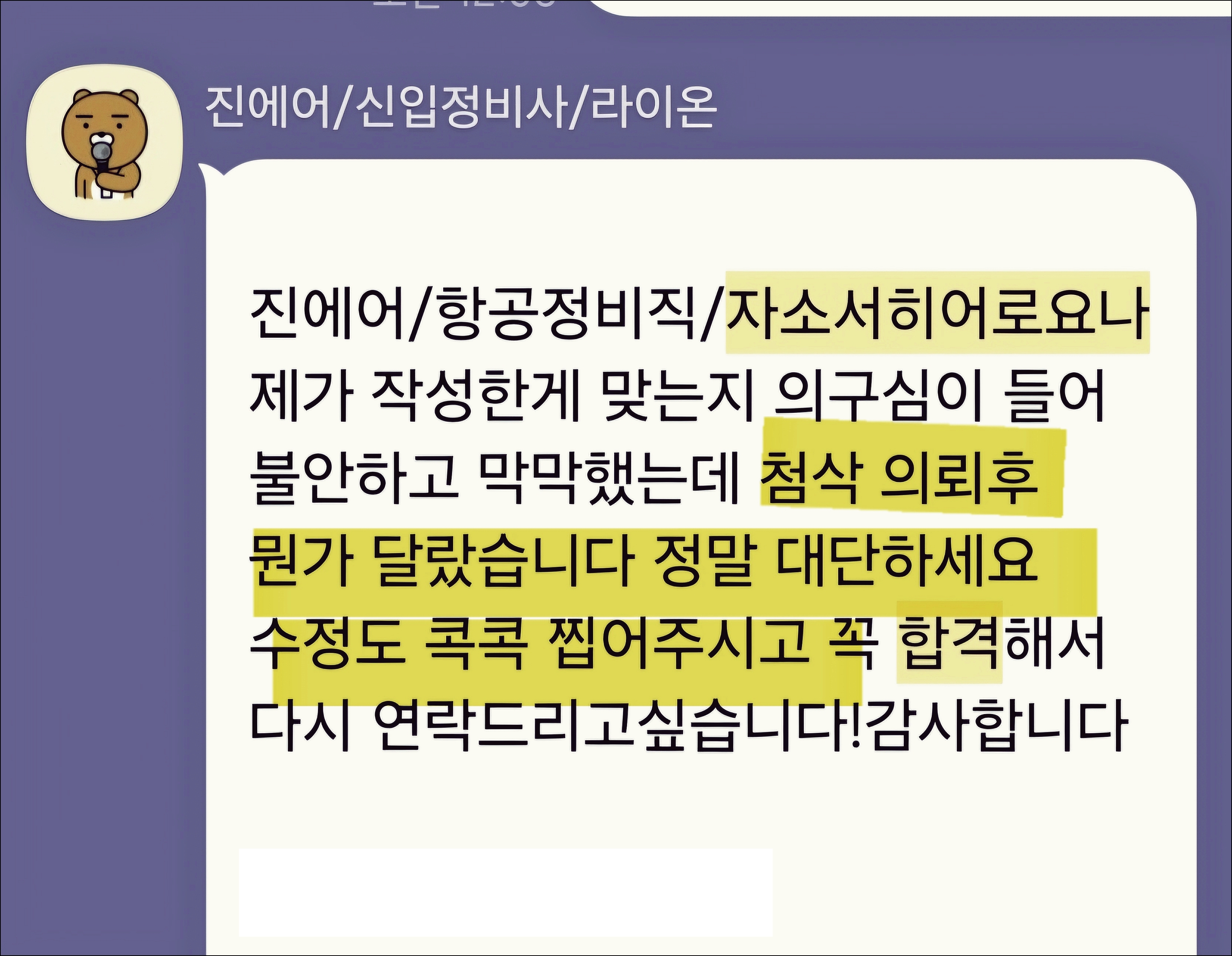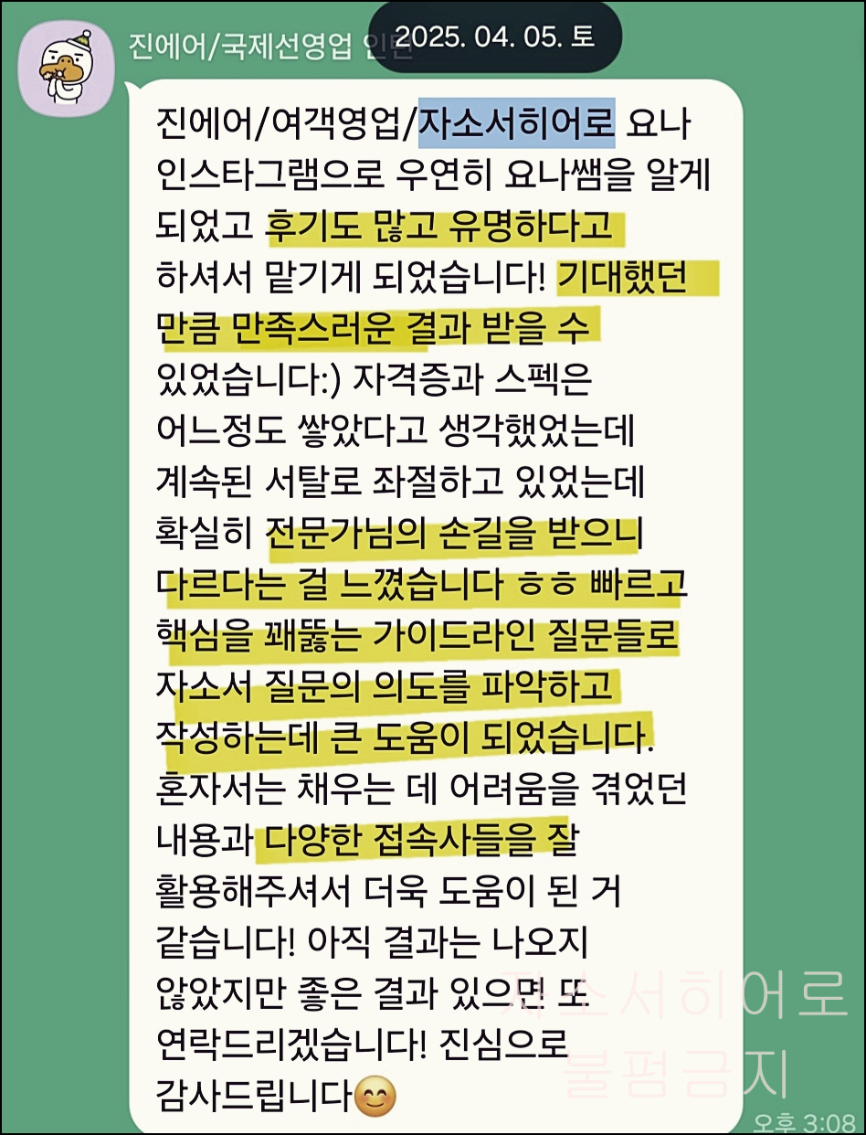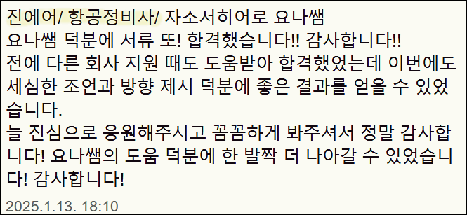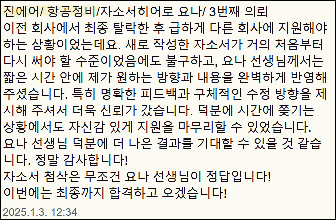 특히 진에어 항공정비직 분야에서는 수많은 지원자들의 서류를 성공적으로 통과시킨 경험을 가지고 있습니다.