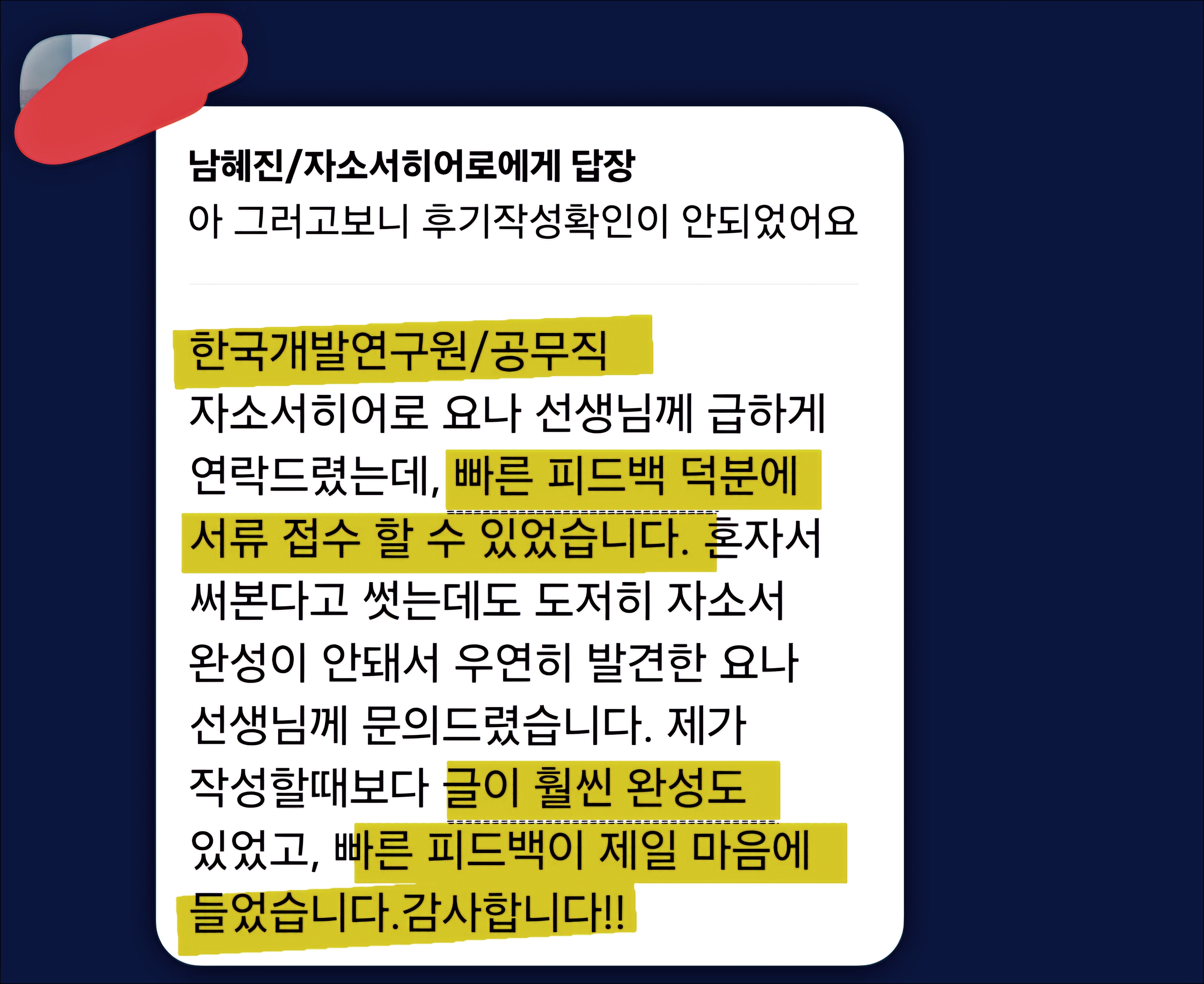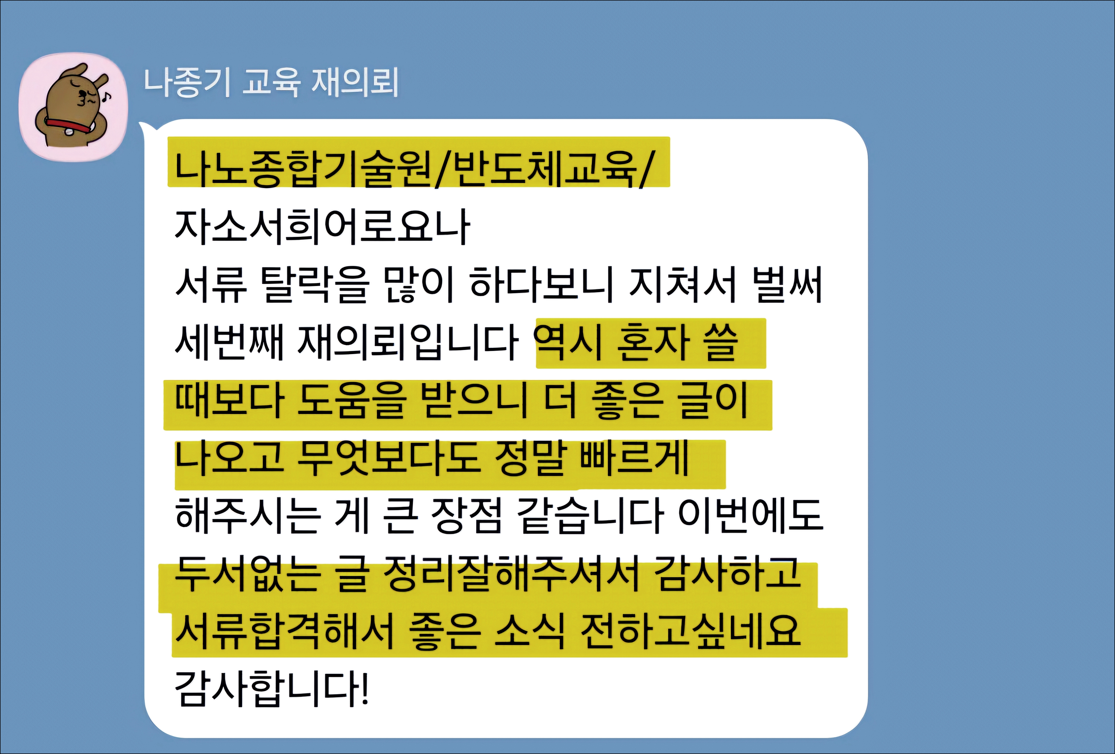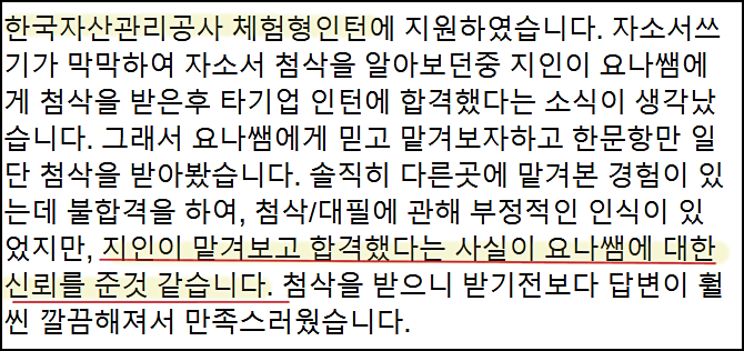 맞춤형 자기소개서 첨삭으로 서류 합격을 보장합니다. 만족도 5.0, 당일 완성 가능!