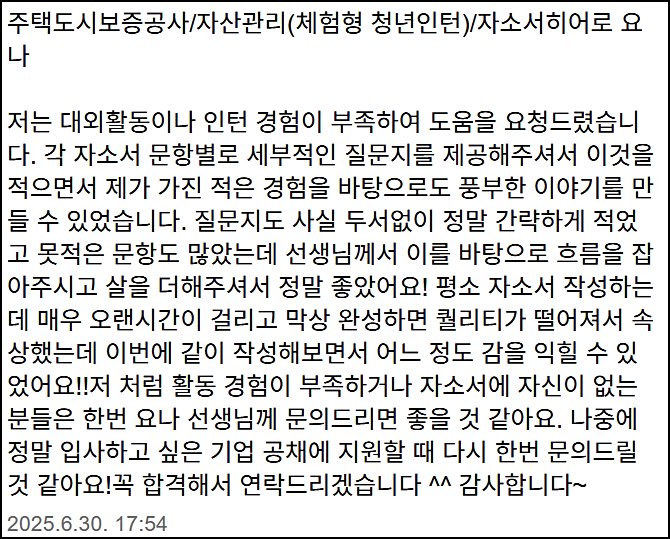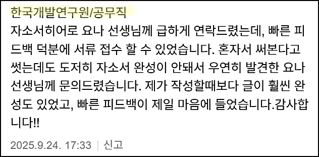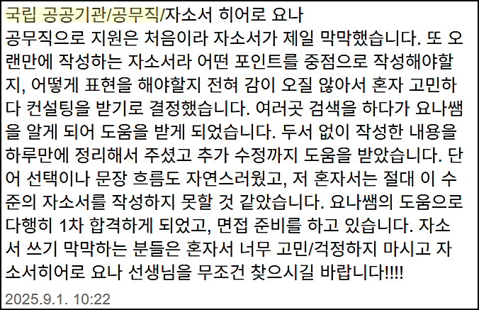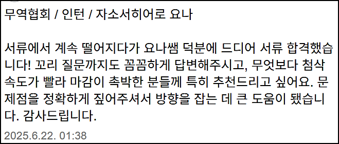 | 25년 3분기 자소서히어로 첨삭 후기: 실제 합격으로 증명된 컨설팅 노하우 (0) | 2025.10.13 |