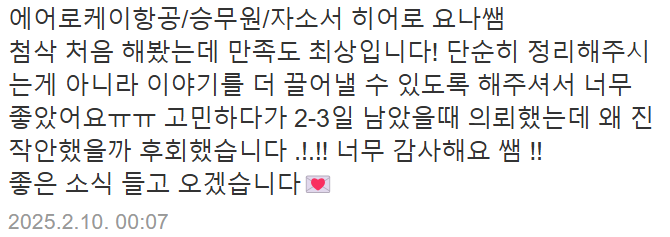 이번 채용은 항공업계에서 꿈을 펼칠 기회이며, 서류전형에서 자기소개서 비중이 매우 높습니다.