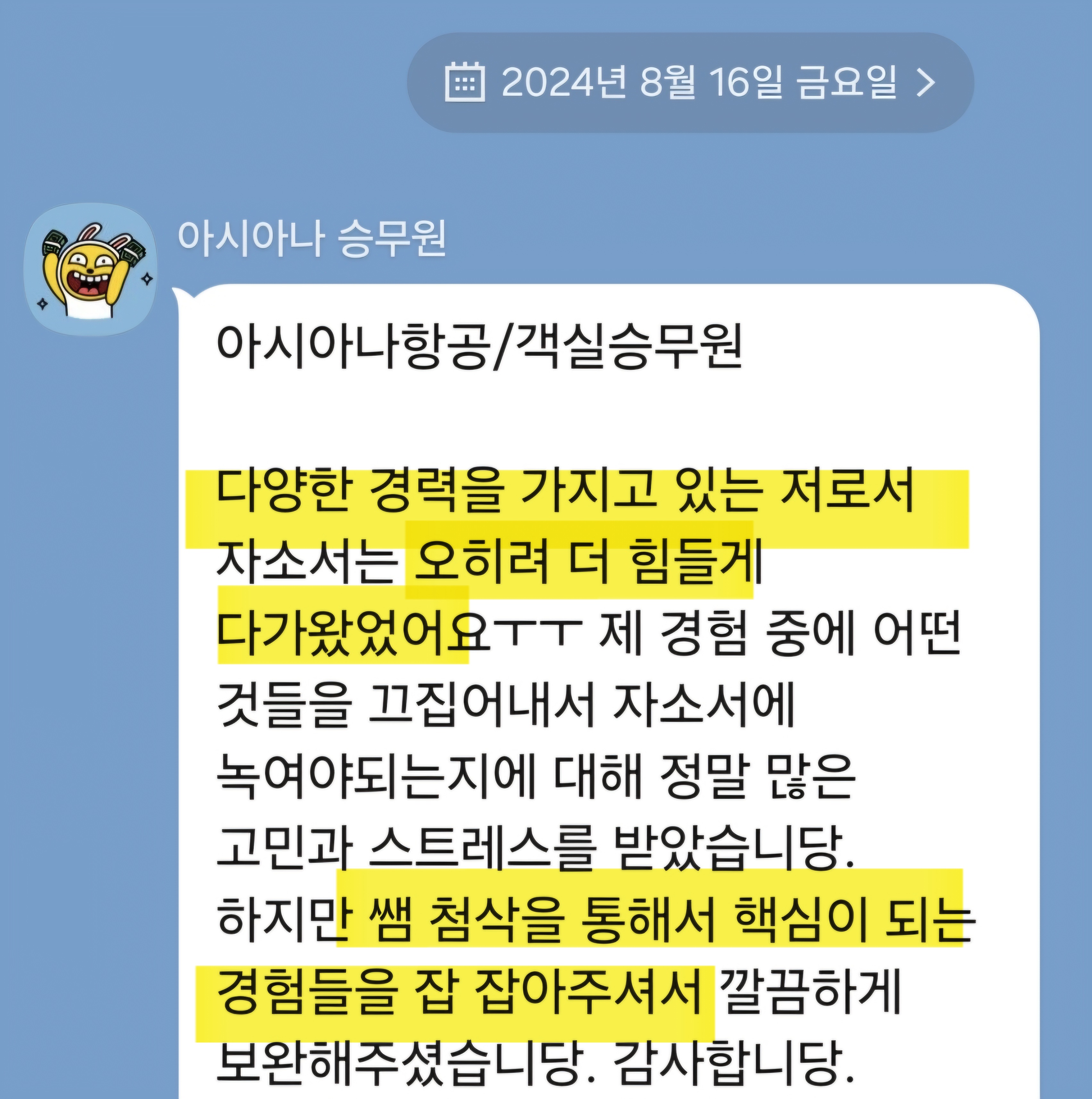 항공사 채용 자기소개서의 핵심은 '차별화된 나만의 경험'을 녹여내는 것! 단순히 예쁜 문장보다 질문 요지에 부합하는 내용을 명확히 전달해야 합니다.