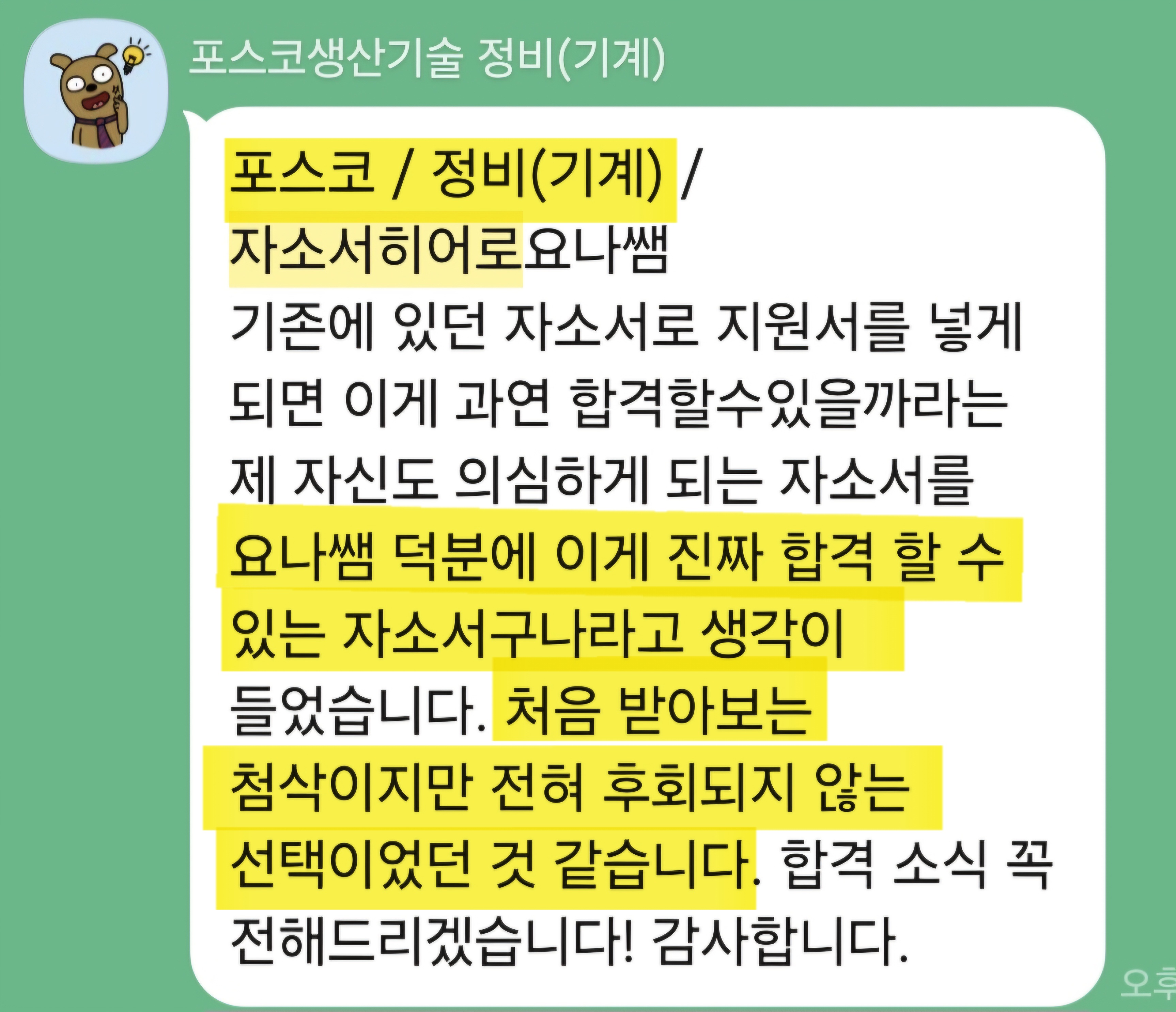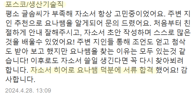 혼자 쓴 자기소개서가 모호하게 느껴졌던 분들도, 첨삭 후에는 명확한 구조와 설득력 있는 문장으로 바뀐 글을 보고 놀라십니다. 실제로 많은 분들이 서류 합격 후 감사 인사를 전해 주시곤 합니다.