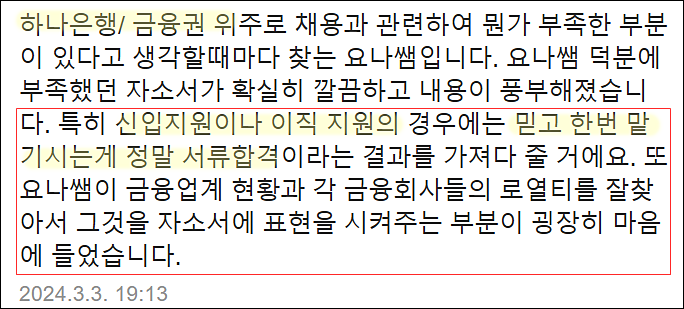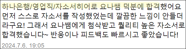 - ✔ 하나은행, 금융권 공기업 합격 자기소개서 다수 보유