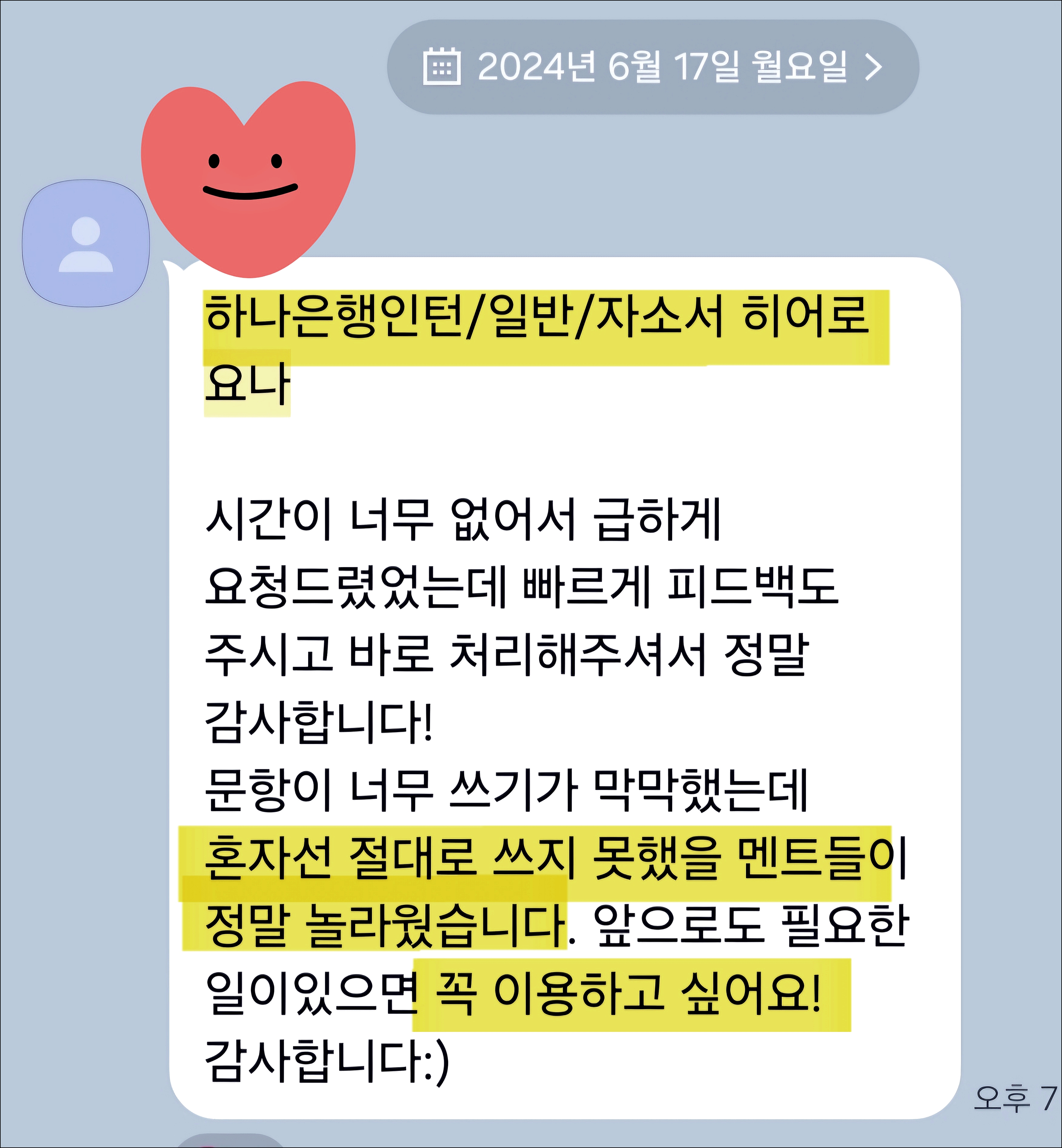 방향을 잡기 어렵다면, 자소서히어로는 24시간 내 첨삭 피드백과 맞춤 작성 서비스를 제공 중입니다. 혼자 고민하지 마세요!